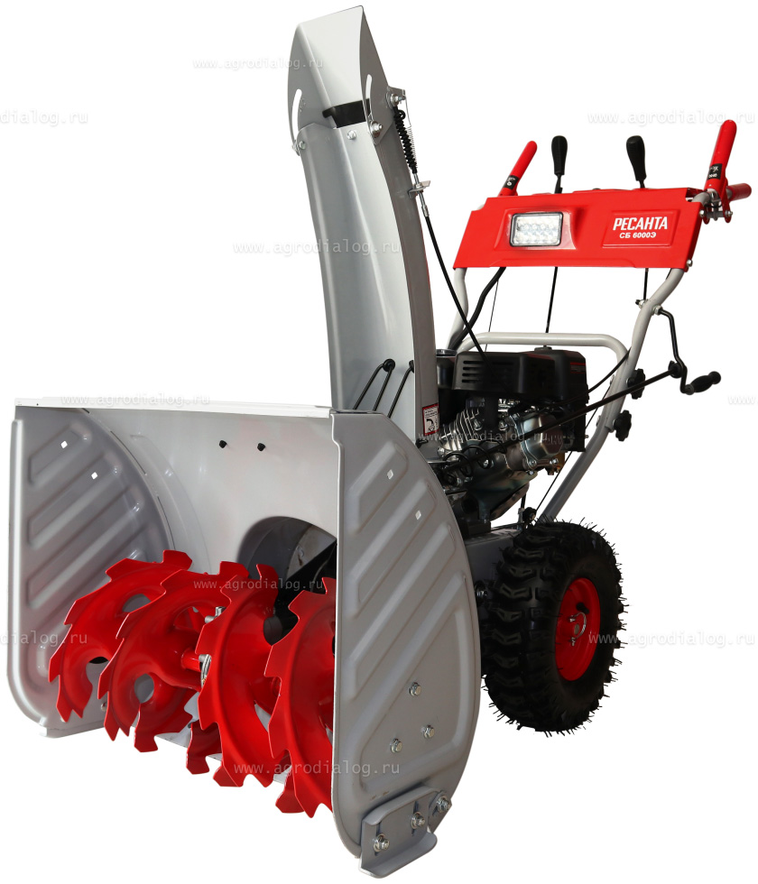 - Для удобства работы и безопасности в тёмное время суток бензиновый снегоуборщик Ресанта СБ 6000Э оборудован LED фарой.