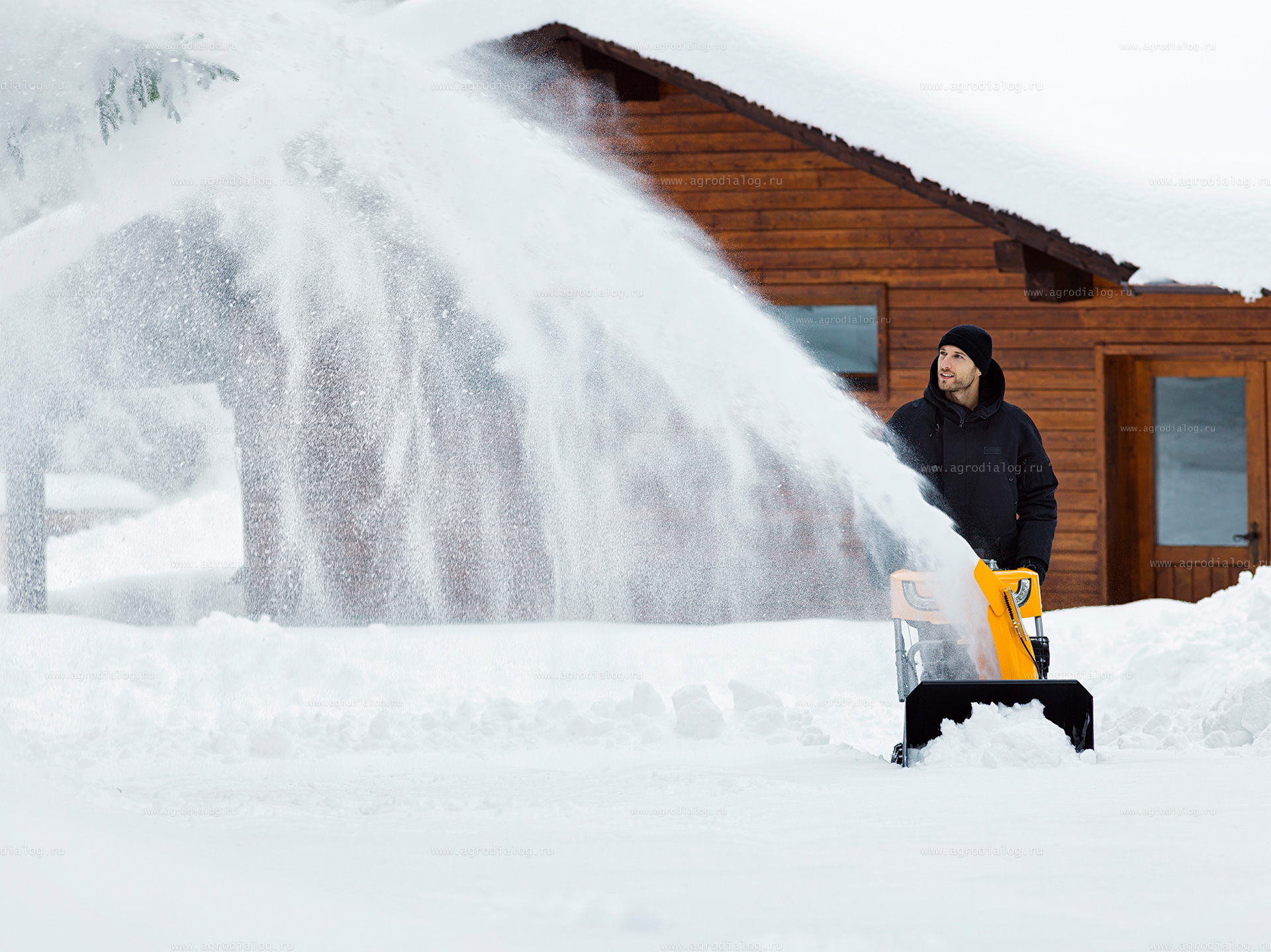 - Single hand control – блокировка ручки управления позволяет освободить одну из рук оператора, когда необходимо переключить скорость или отрегулировать направление выброса снега без остановки снегоуборщика.