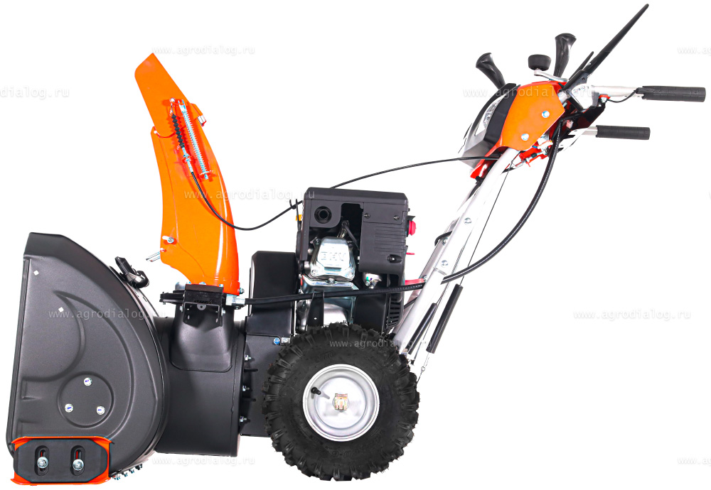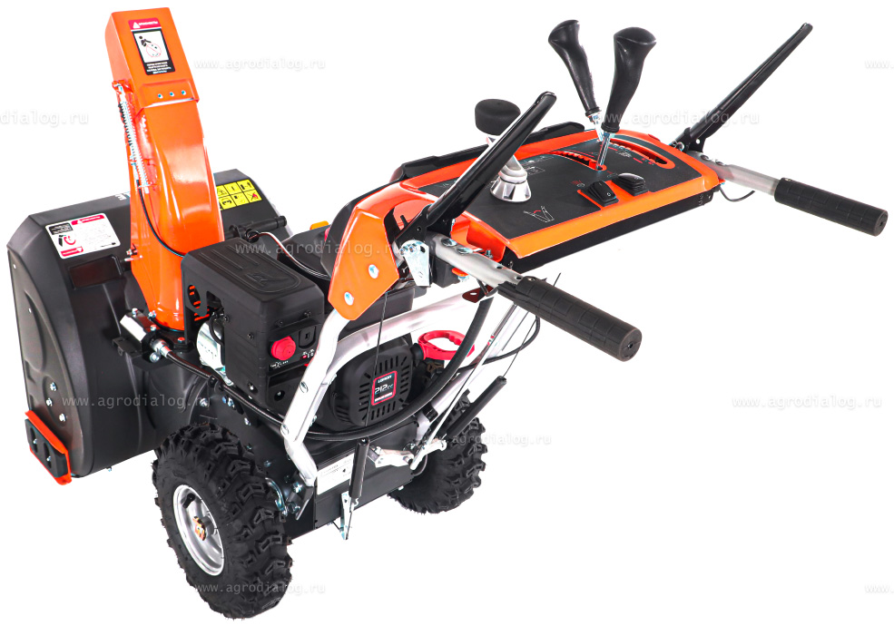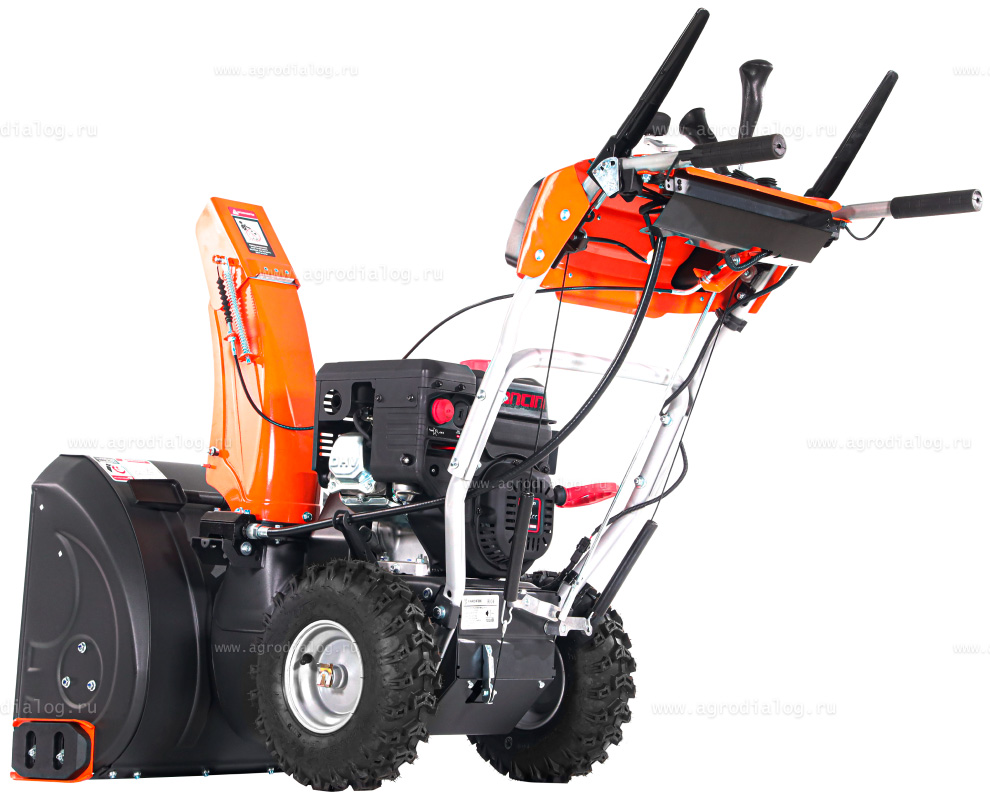 - Free hand control – блокировка ручки управления позволяет освободить одну из рук оператора, когда необходимо переключить скорость или отрегулировать направление выброса снега без остановки снегоуборщика.
