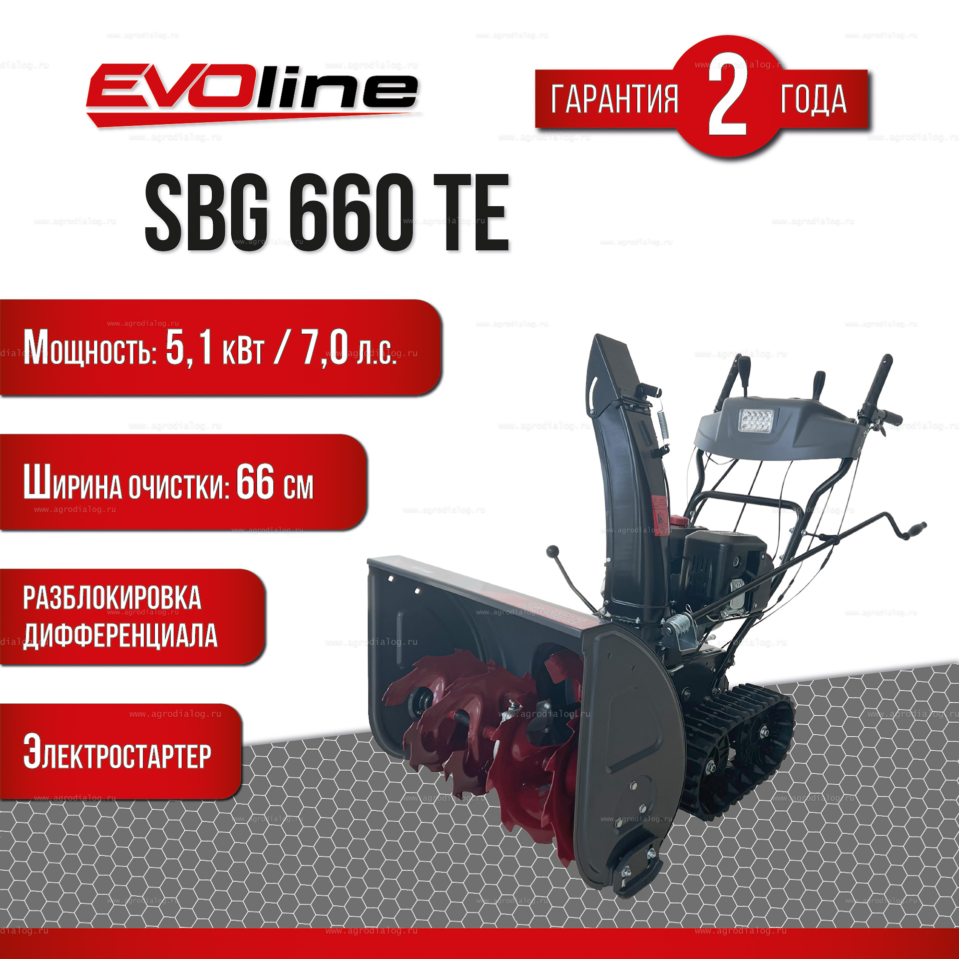 - Гусеничный бензиновый снегоуборщик EVOline SBG 660 TE оснащен двухступенчатой системой уборки снега обеспечивающей эффективную расчистку с превосходным результатом.