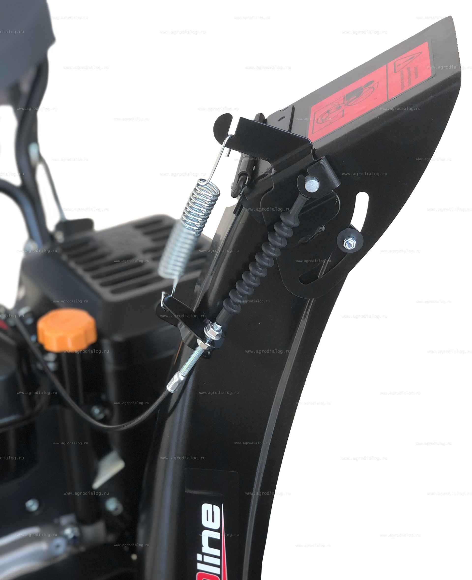 - Металлический желоб выброса с системой регулировки вращения обеспечивает возможность изменения направление отбрасывания снега при помощи операторской рукоятки управления, угол выброса регулируется при помощи удобной рукоятки расположенной на панели управления.