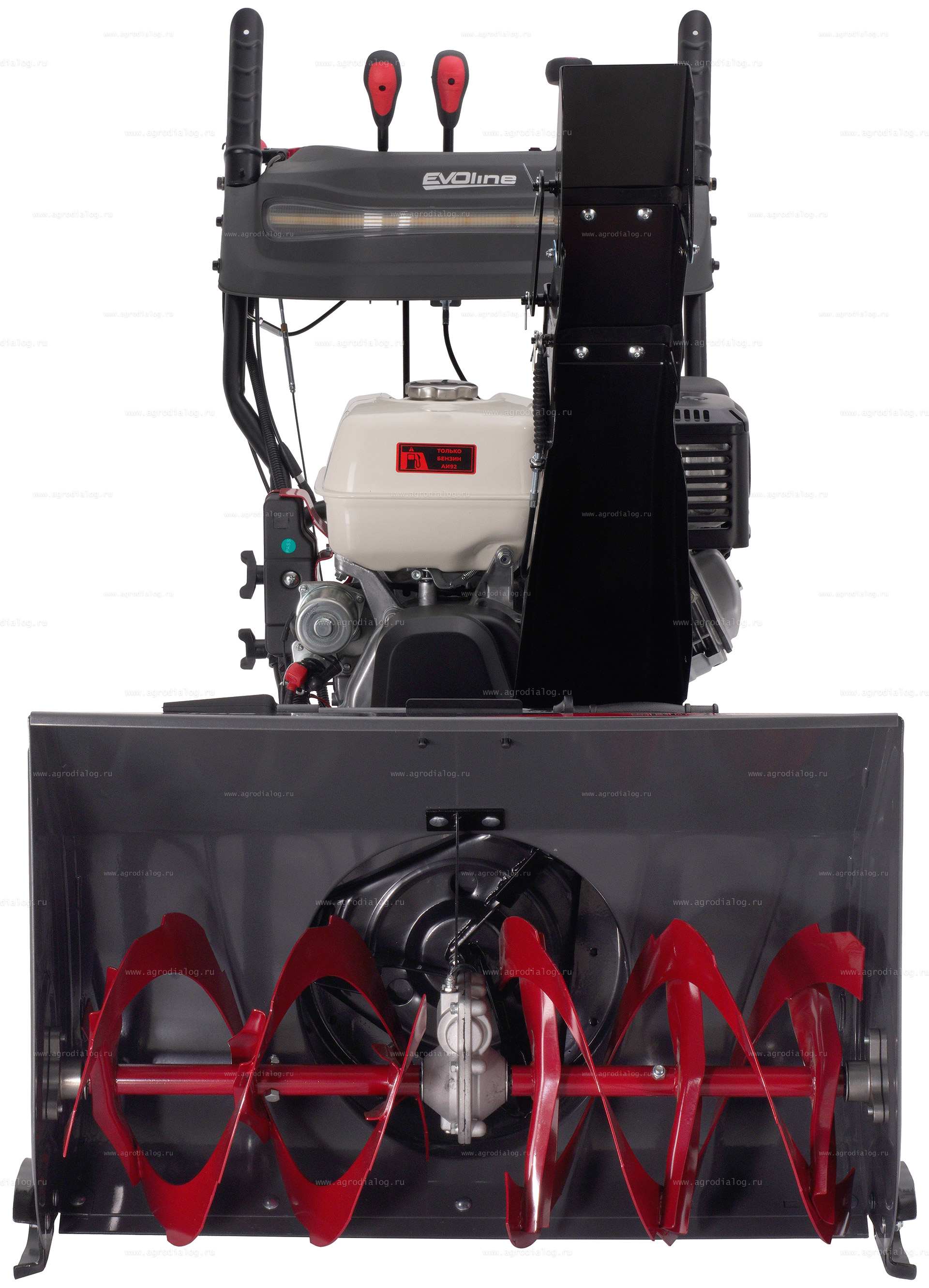 - Для удобства работы и безопасности в тёмное время суток гусеничный бензиновый снегоуборщик EVOline SBG 760 THE оборудован фарой.