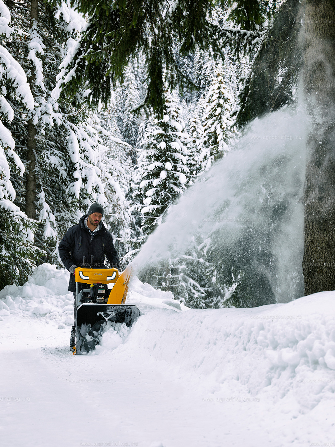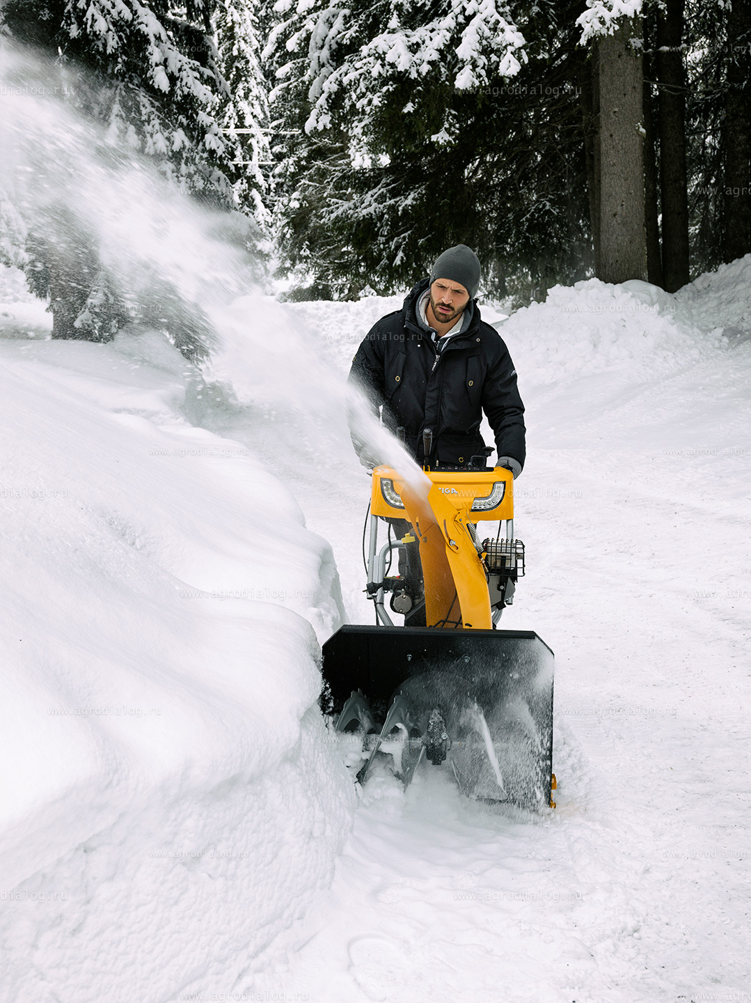 - Для удобства работы и безопасности в тёмное время суток, снегоуборщик оборудован двумя светодиодными фарами.