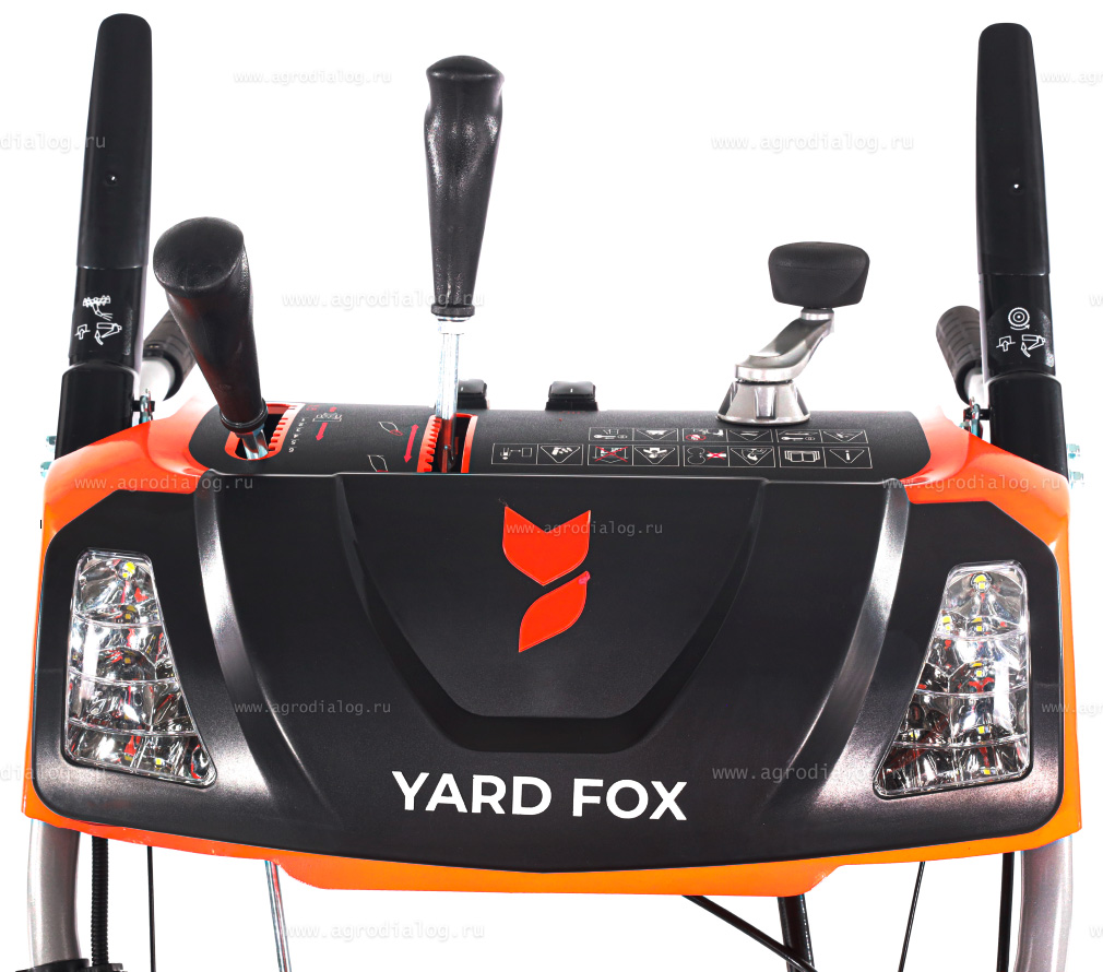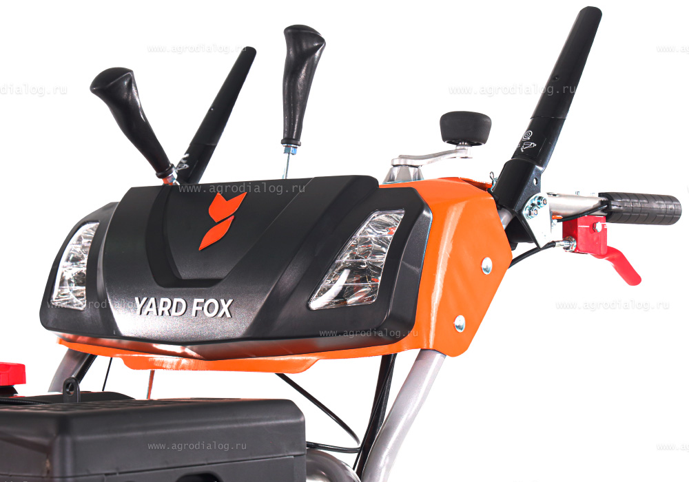 - Для удобства работы и безопасности в тёмное время суток гусеничный бензиновый снегоуборщик YARD FOX PRO 6654ET оборудован двойной светодиодной фарой.