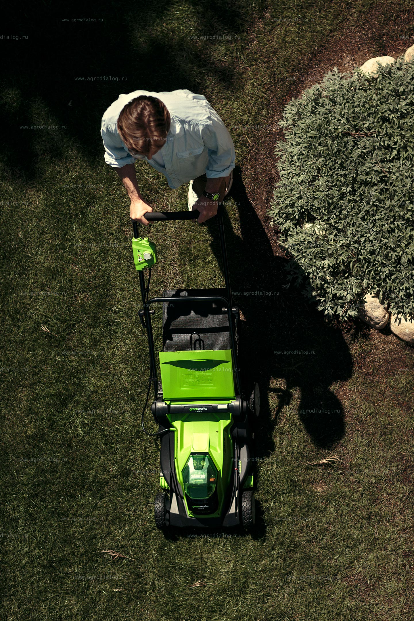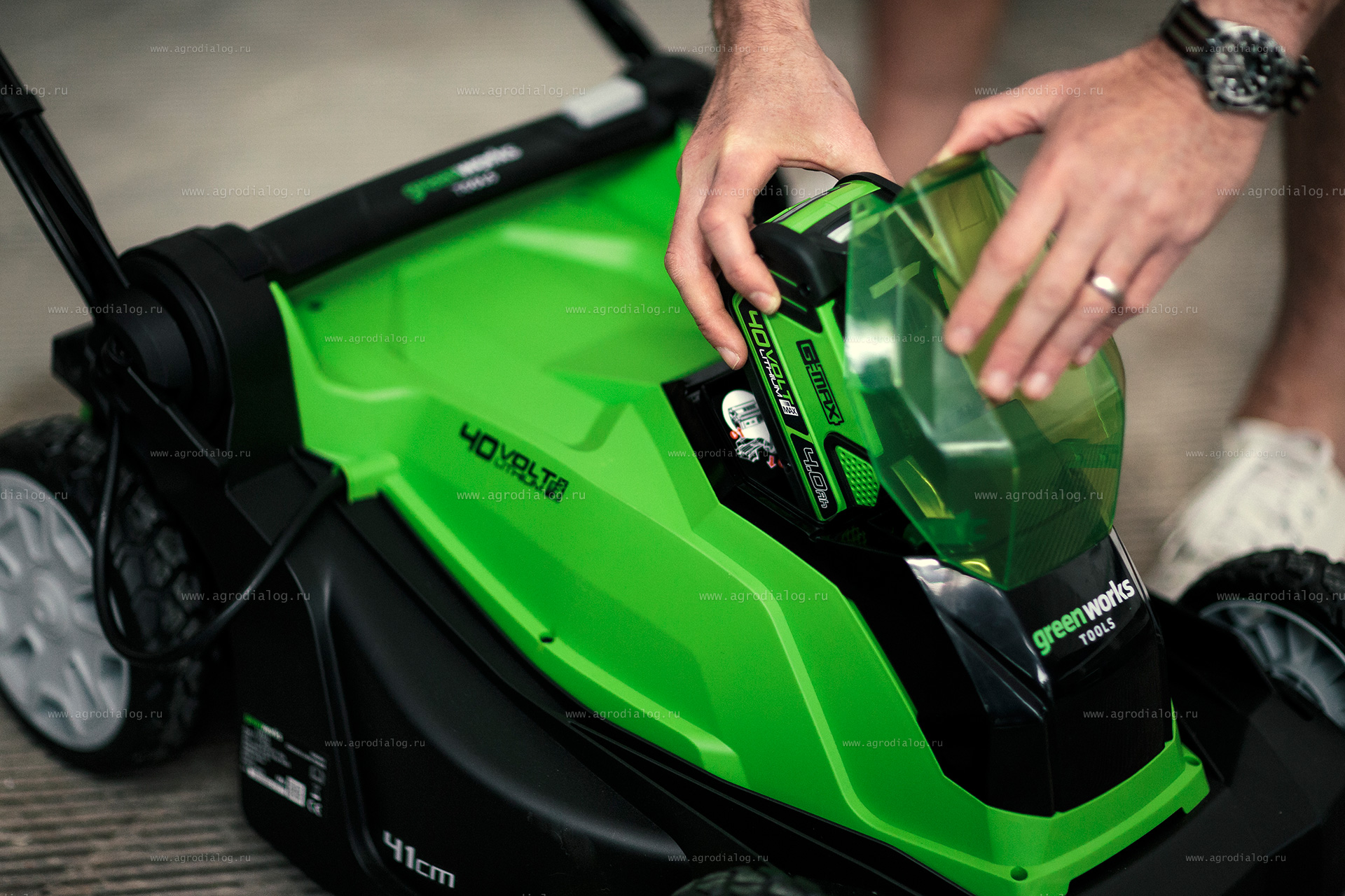 - Несамоходная аккумуляторная газонокосилка Greenworks G40LM41K5 работает от аккумуляторной батареи, которая подходит ко всем инструментам системы 40V. Один аккумулятор и одно зарядное устройство для разных групп инструментов – это рационально и эффективно.