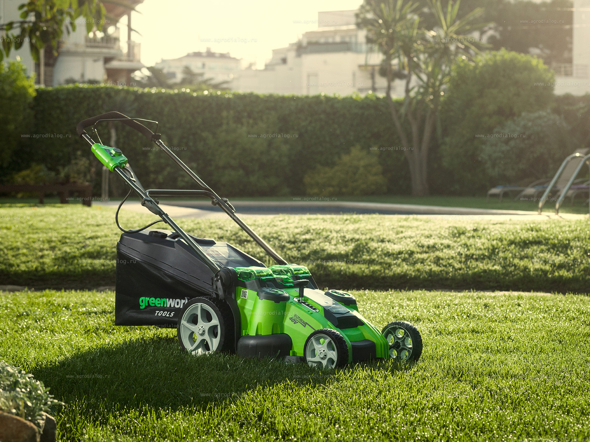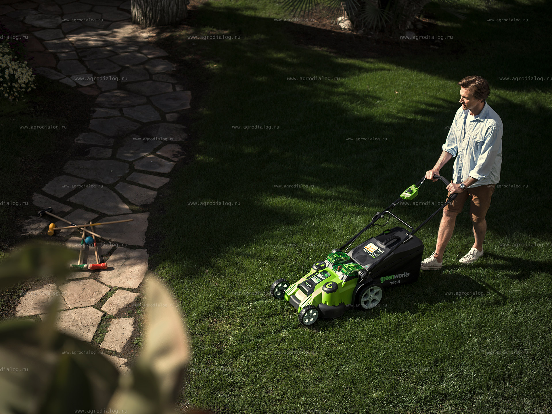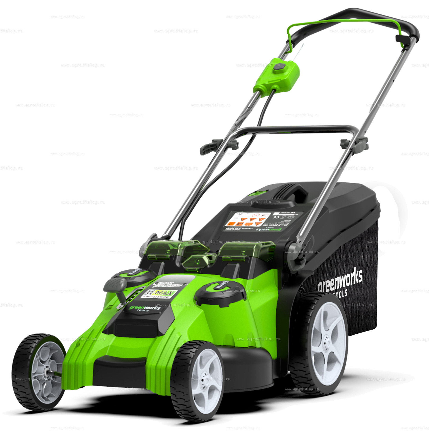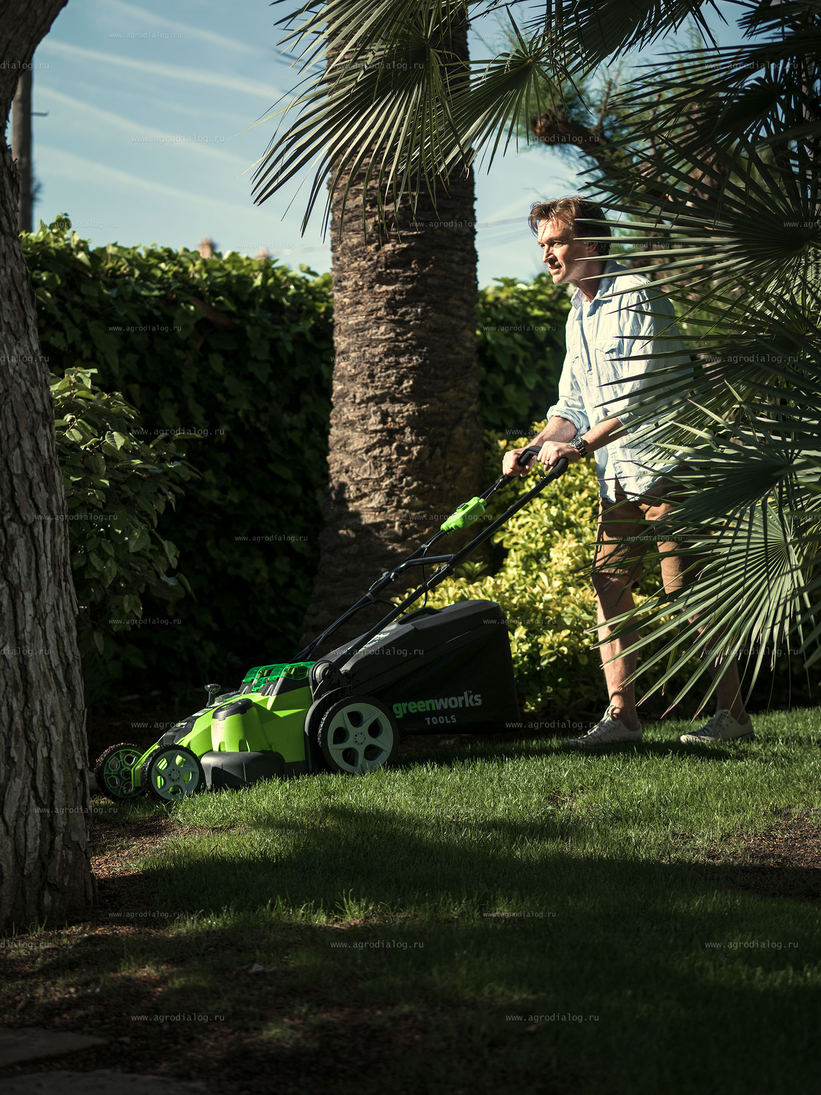 - Несамоходная аккумуляторная газонокосилка Greenworks G40LM49DB оснащена сразу 2-мя двигателями и 2-мя лезвиями. Лезвия расположены не параллельно и вращаются в противоположных направлениях, благодаря чему создается аэродинамический эффект восходящего потока, который поднимает траву непосредственно перед моментом среза.