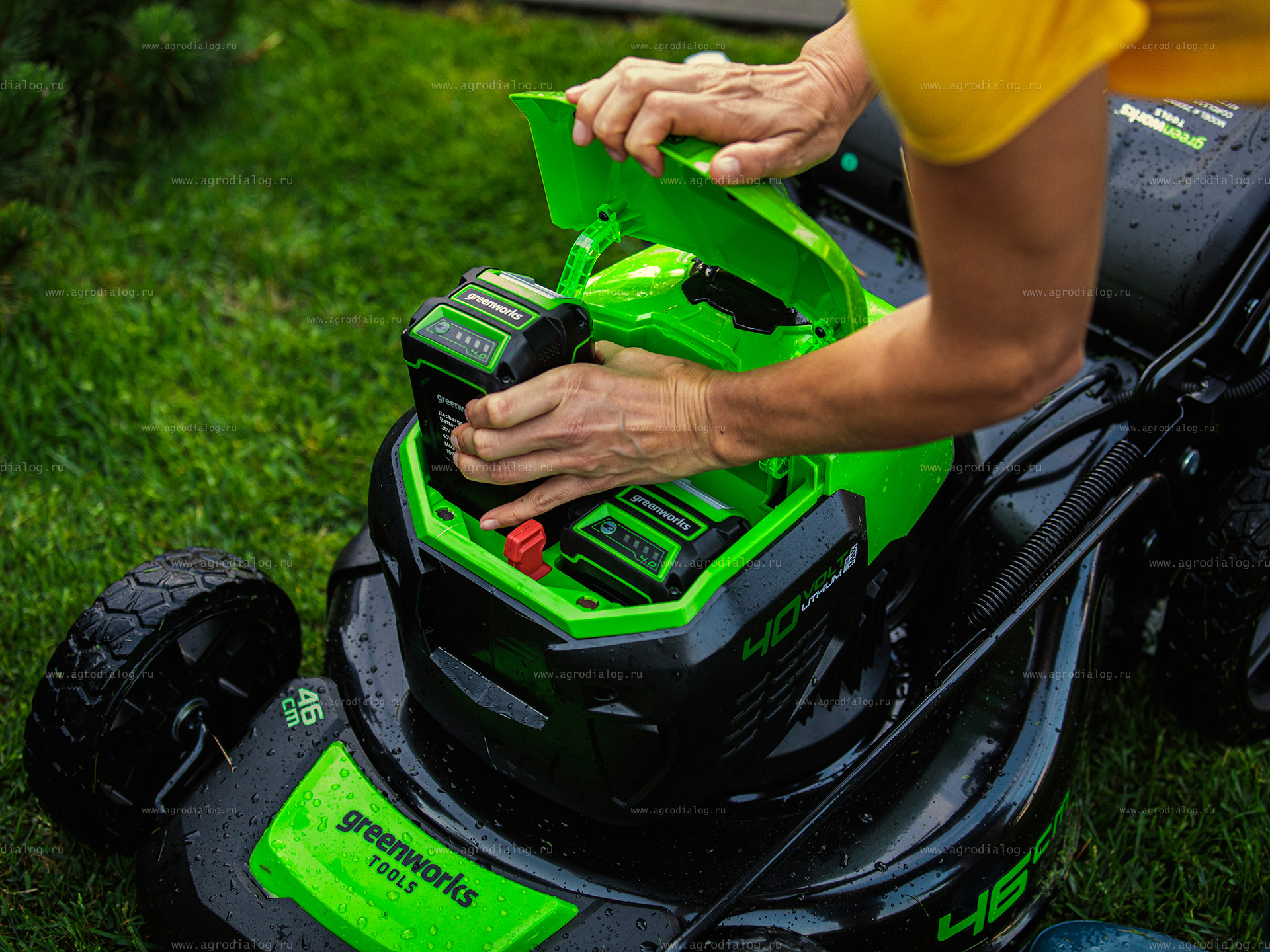 - Аккумуляторная газонокосилка Greenworks GD40LM46SP имеет один отсек питающего аккумулятора и дополнительный отсек для хранения запасного аккумулятора. Когда основной аккумулятор разряжается, вам не нужно идти за новым – достаточно просто поменять аккумуляторы местами.
