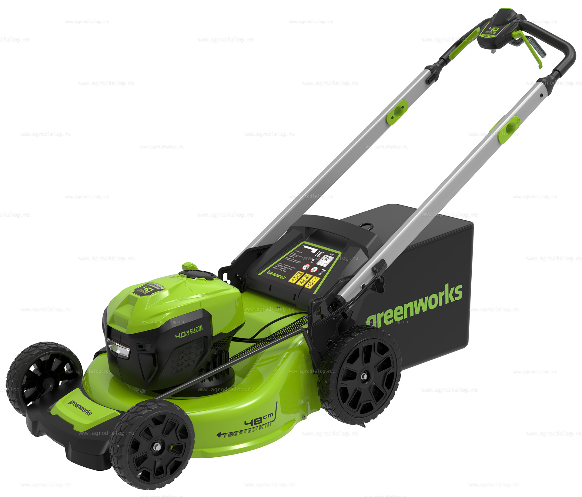 - Самоходная аккумуляторная газонокосилка Greenworks GD40LM48SPK5 работает от аккумуляторной батареи, которая подходит ко всем инструментам системы 40V. Один аккумулятор и одно зарядное устройство для разных групп инструментов – это рационально и эффективно.