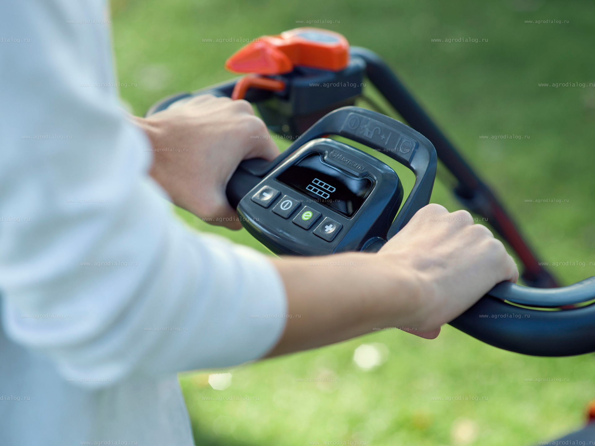 - Вся нужная для управления газонокосилкой информация сконцентрирована в одном месте – на задней рукоятке модели. Панель управления предельно проста в использовании.