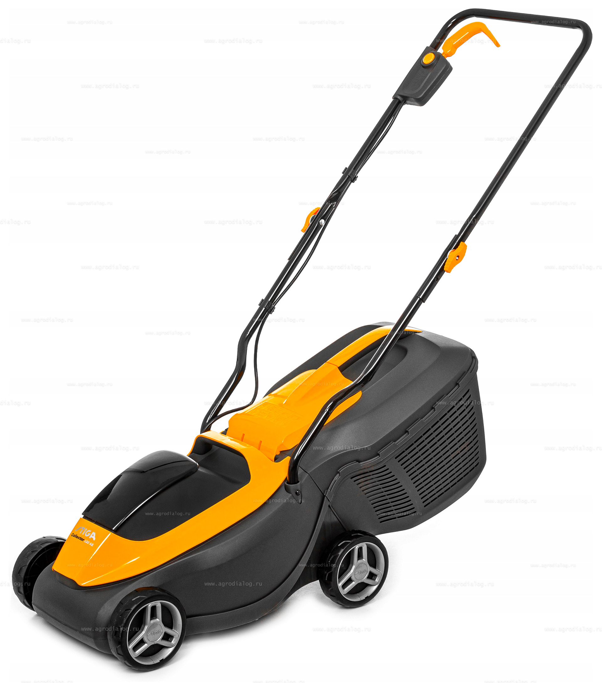 - Рукоятка управления регулируется по высоте в двух положениях. В то же время она может складываться для удобного и компактного хранения газонокосилки.