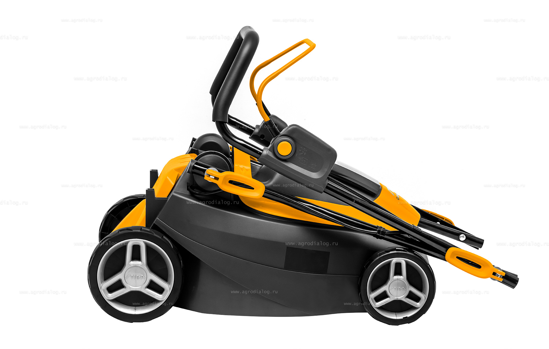 - Рукоятка управления регулируется по высоте: никаких болтов подкручивать не нужно, у нее есть быстрозажимные фиксаторы. В то же время она может складываться для удобного и компактного хранения газонокосилки.