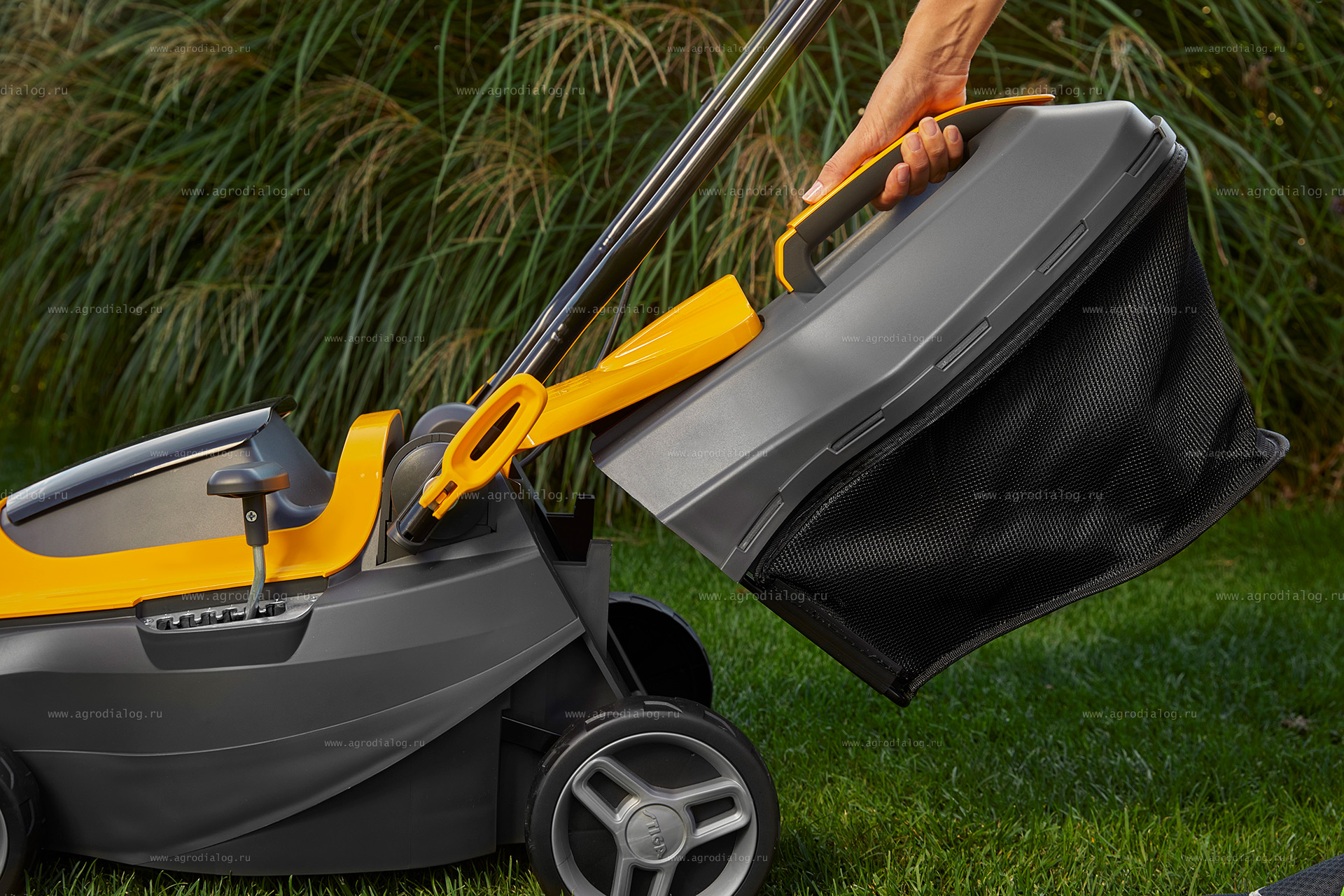 - Сбор травы в травосборник придает газону законченный и чистый вид, тканый материал, применяемый при его изготовлении, надежно удерживает пыль и пыльцу растений, благодаря чему люди, страдающие аллергией, могут работать в свое удовольствие.