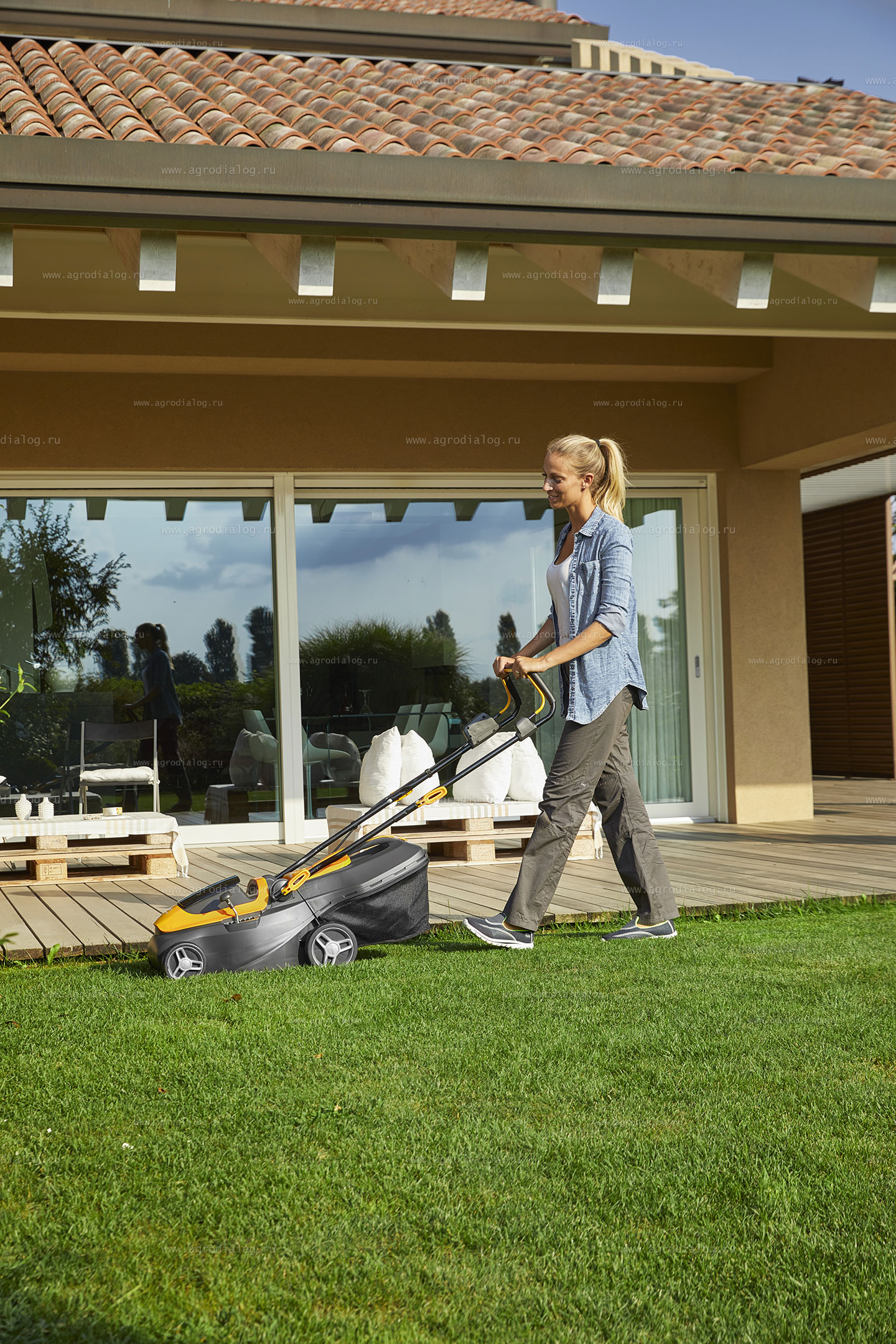 - Задний выброс без травосборника удобен при скашивании высокой травы.