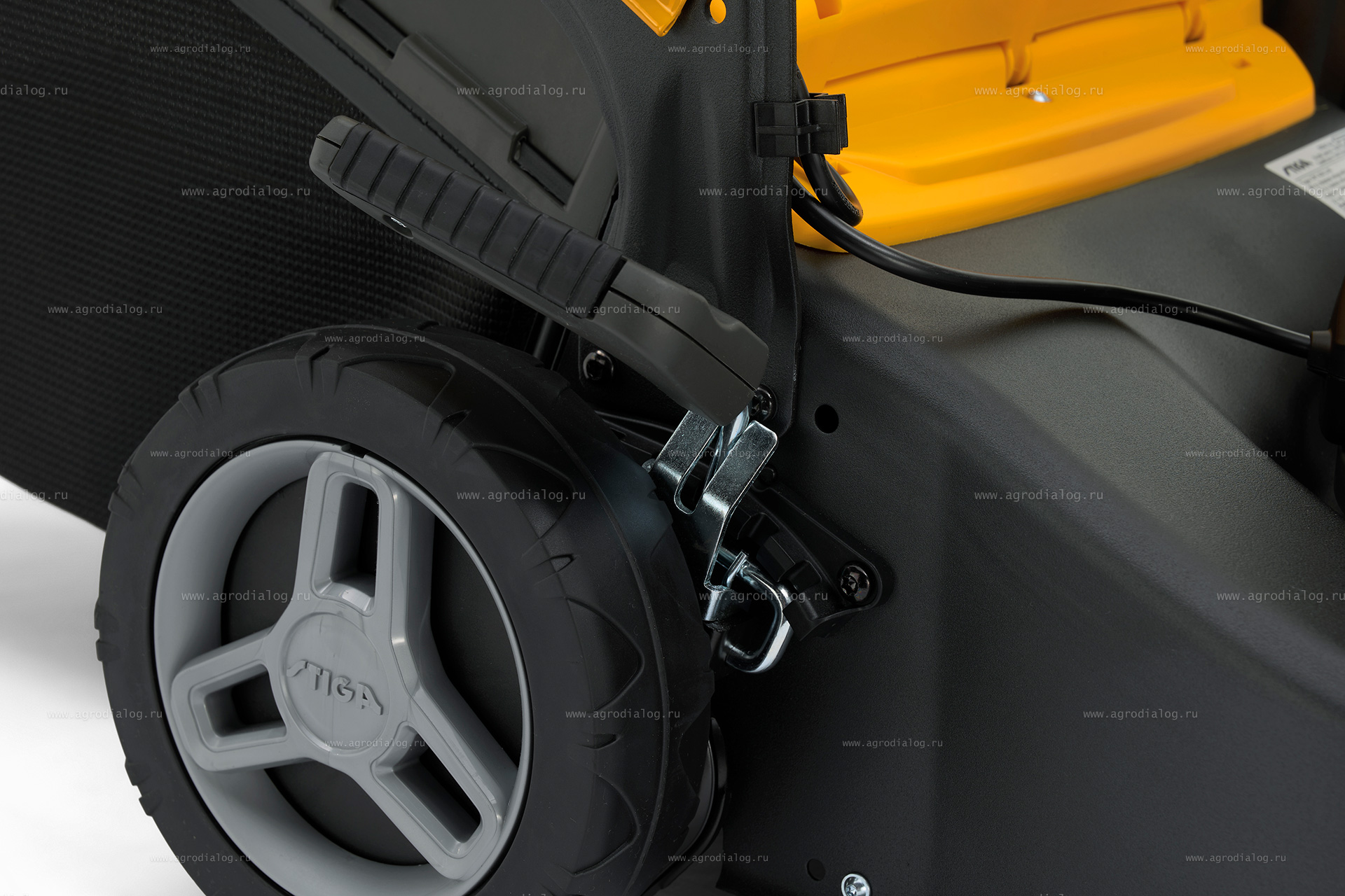 - Эргономичная рукоятка управления обеспечивает минимальное напряжение рук в ходе работы, возможность регулировки по высоте позволяет подобрать наиболее удобное положение людям разного роста. Складывается для удобной транспортировки и хранения.