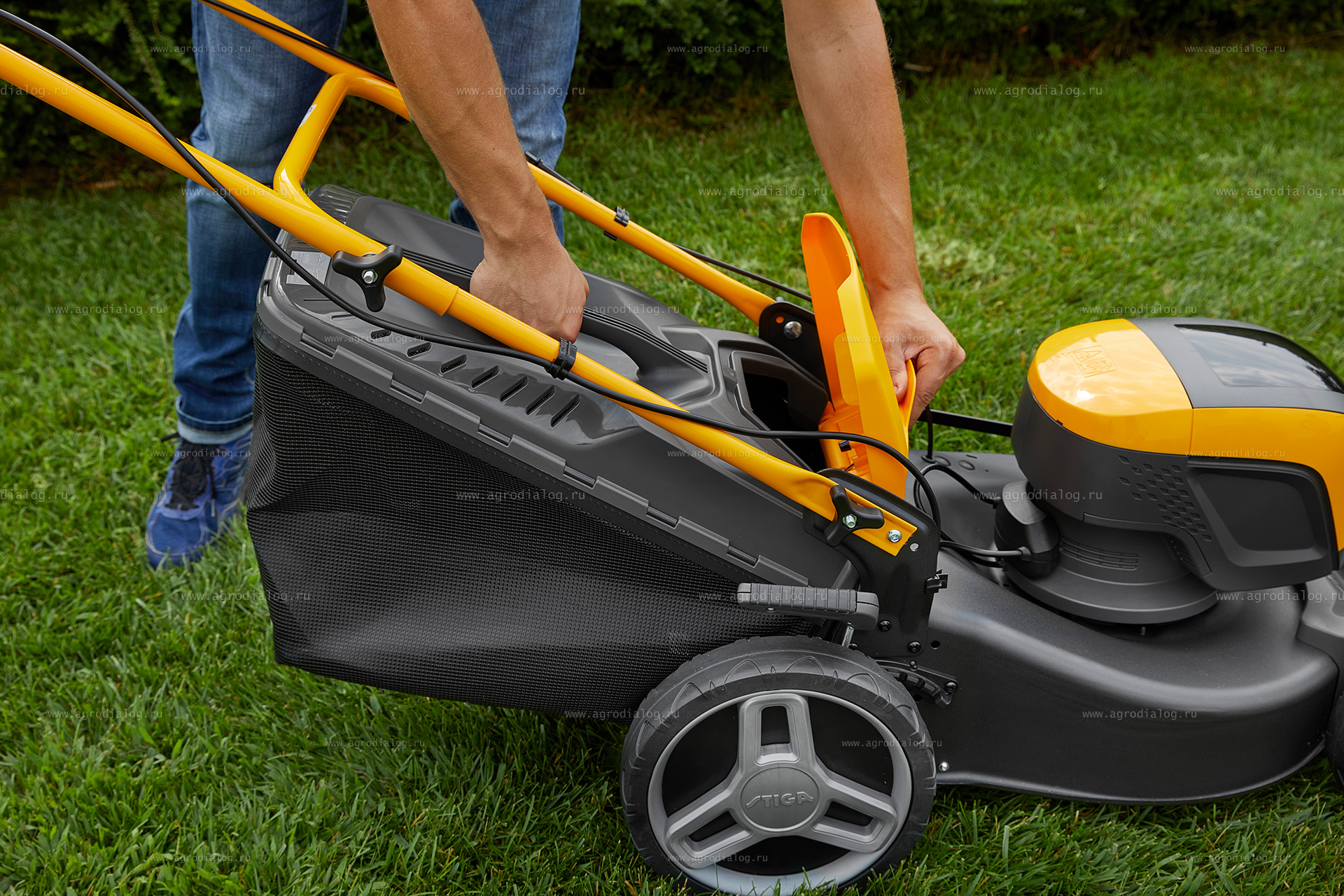 - Сбор травы в травосборник придает газону законченный и чистый вид, тканый материал, применяемый при его изготовлении, надежно удерживает пыль и пыльцу растений, благодаря чему люди, страдающие аллергией, могут работать в свое удовольствие. Индикатор заполнения травосборника подскажет о необходимости его опустошения.
