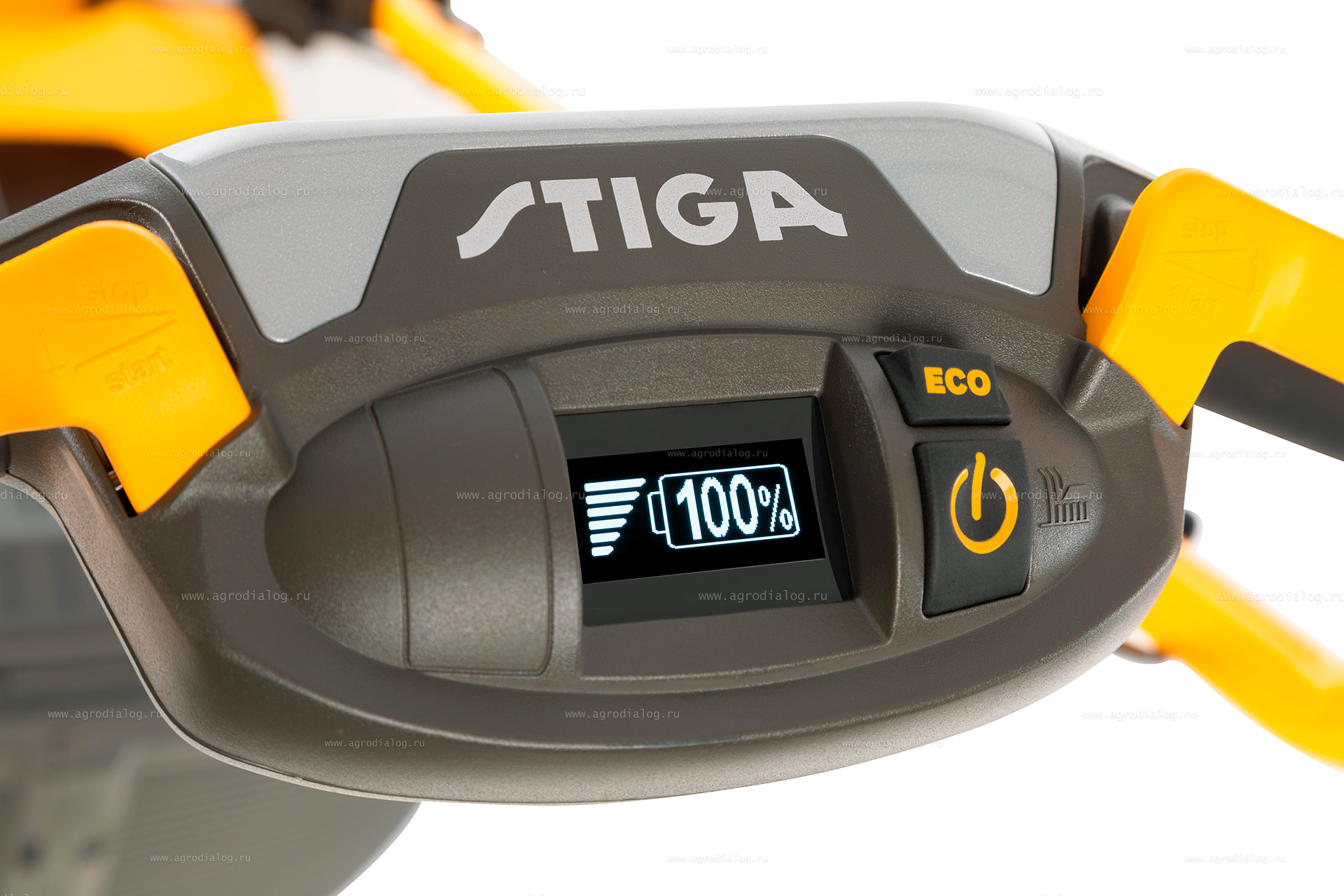 - Функция экономного расхода заряда батареи ECO уменьшает скорость вращения двигателя с 2900 до 2600 об/мин, что позволяет увеличить время эксплуатации до 15% (рекомендуется включать при кошении сухой травы).