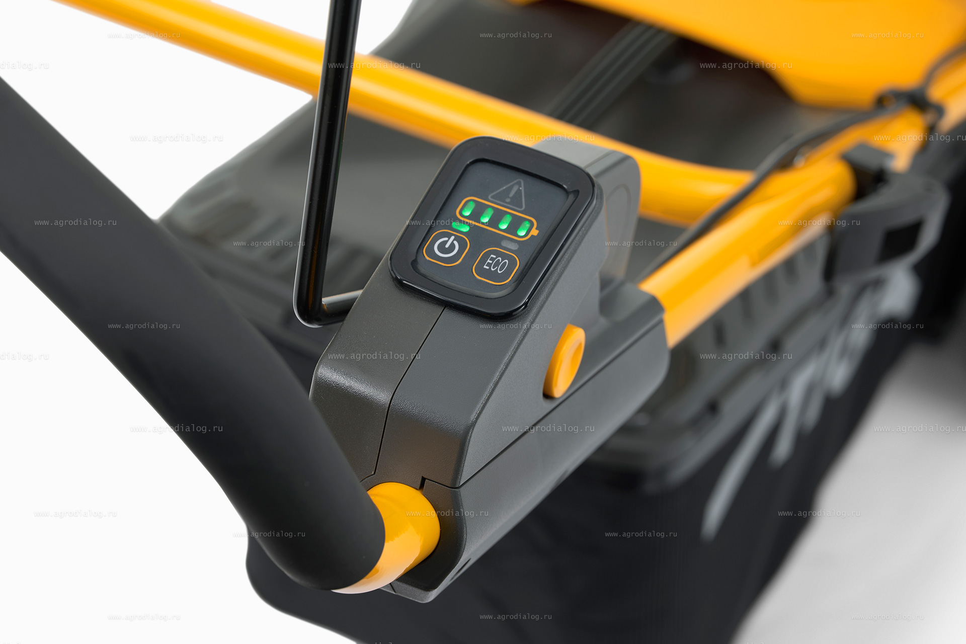 - Вся нужная информация для управления газонокосилкой сконцентрирована в одном месте – на рукоятке модели: активация ECO режима, заряд аккумуляторной батареи.