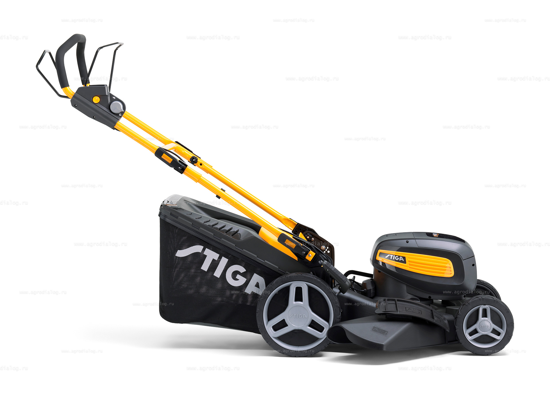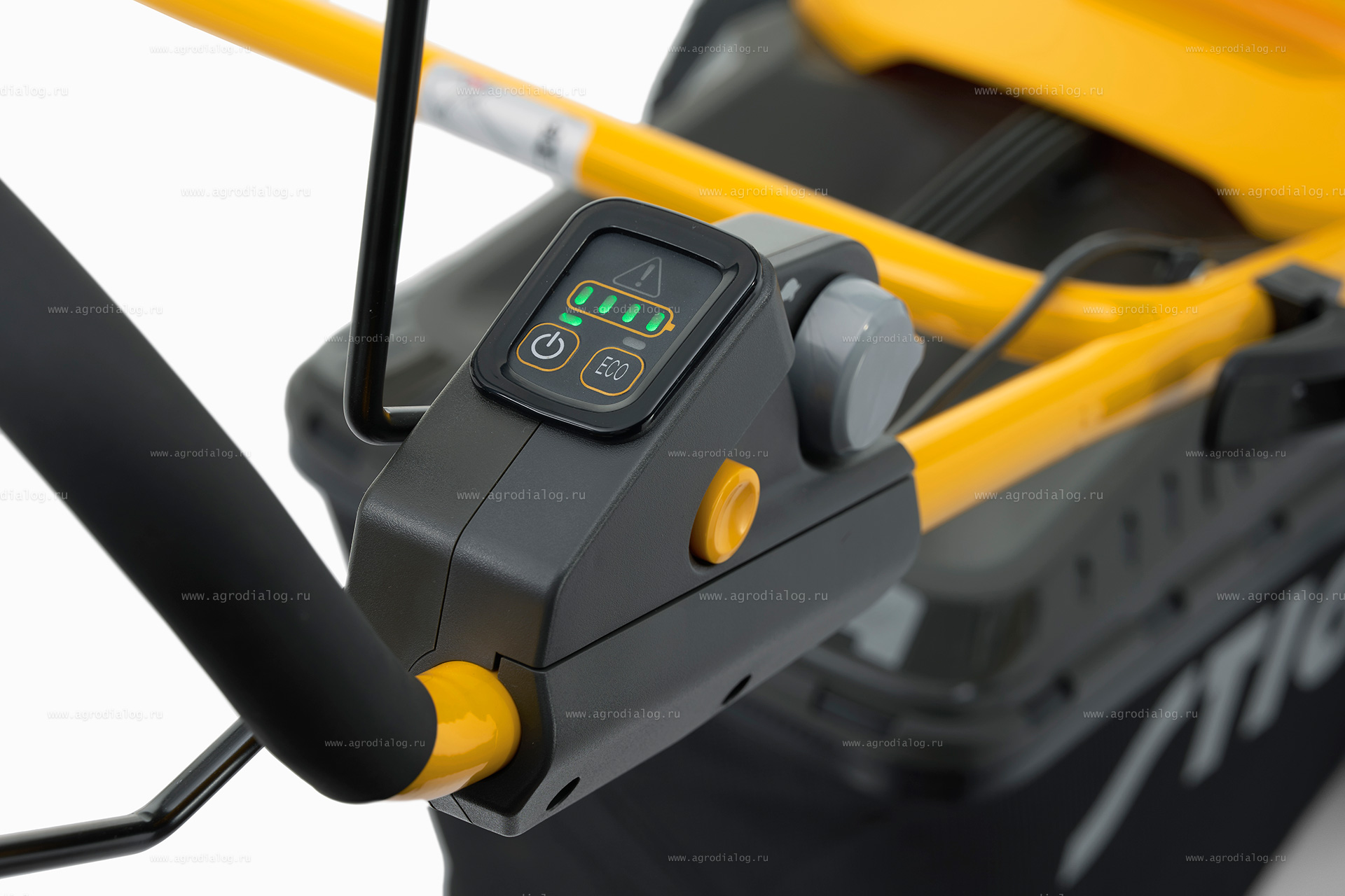 - Вся нужная информация для управления газонокосилкой сконцентрирована в одном месте – на рукоятке модели: активация ECO режима, заряд аккумуляторной батареи.