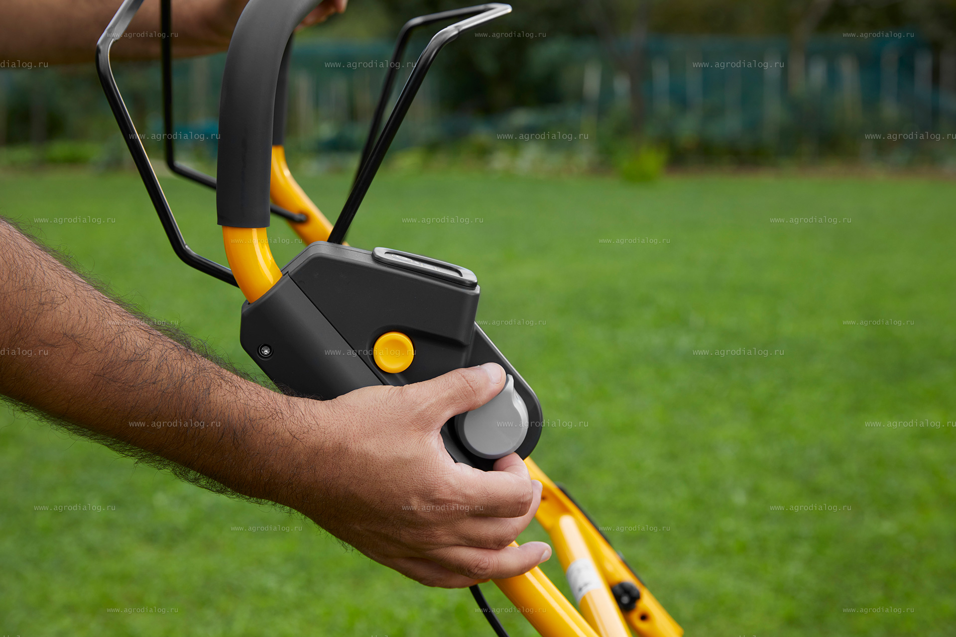 - Эргономичная рукоятка управления обеспечивает минимальное напряжение рук в ходе работы, возможность регулировки по высоте позволяет подобрать наиболее удобное положение людям разного роста. Складывается для удобной транспортировки и хранения.