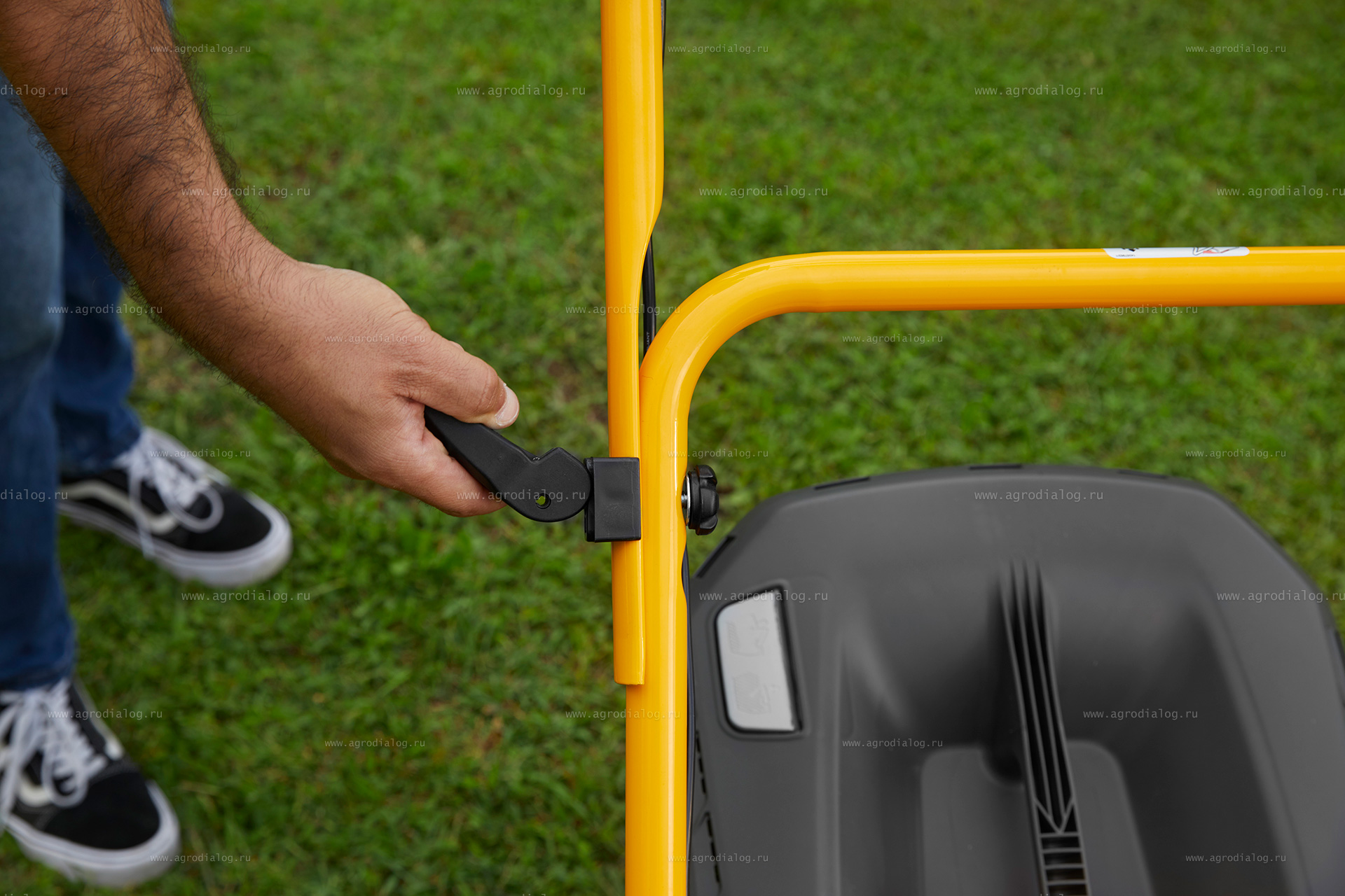 - Эргономичная рукоятка управления обеспечивает минимальное напряжение рук в ходе работы, возможность регулировки по высоте позволяет подобрать наиболее удобное положение людям разного роста. Складывается для удобной транспортировки и хранения.