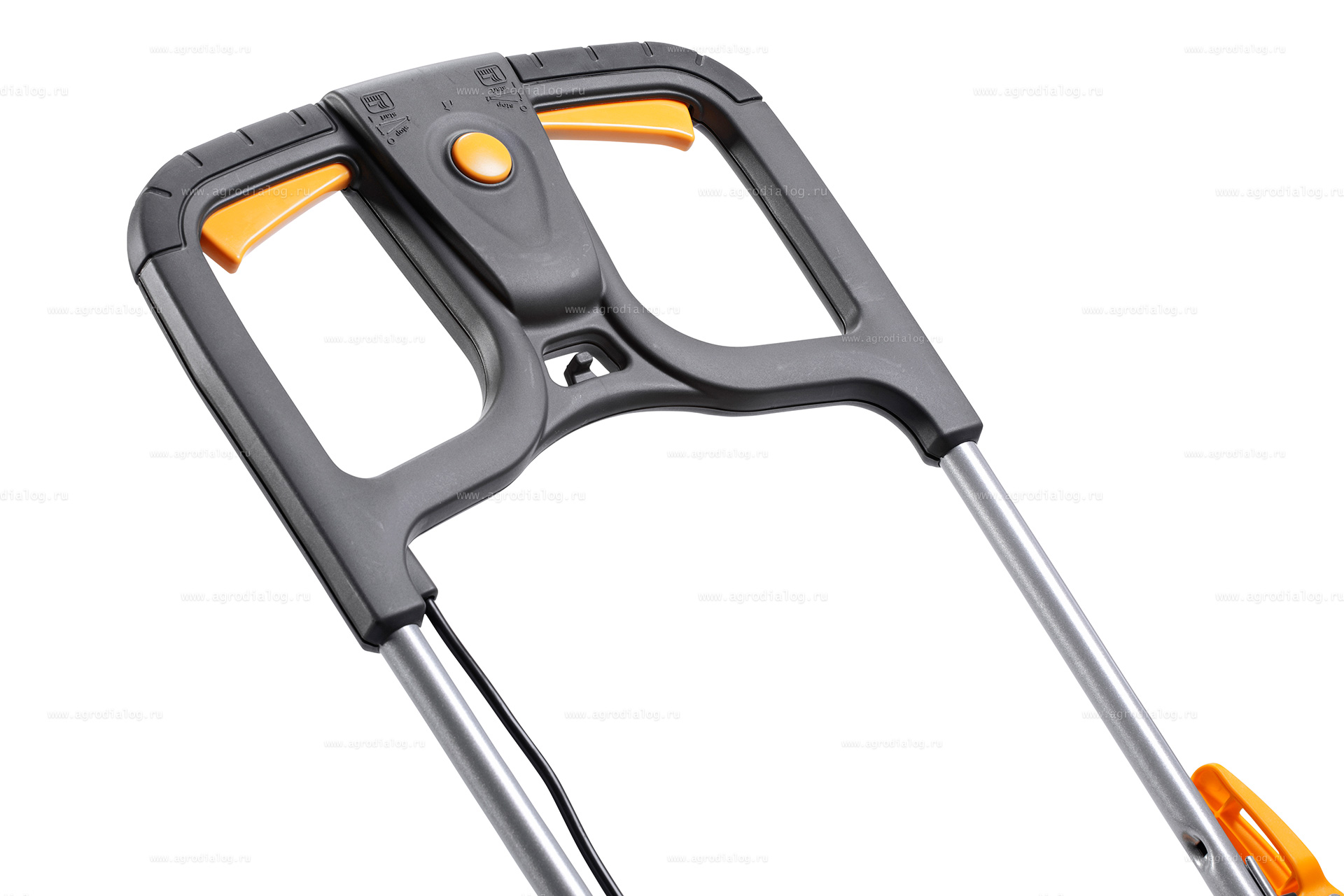 - Рукоятка управления регулируется по высоте: никаких болтов подкручивать не нужно, у нее есть быстрозажимные фиксаторы. В то же время она может складываться для удобного и компактного хранения газонокосилки.