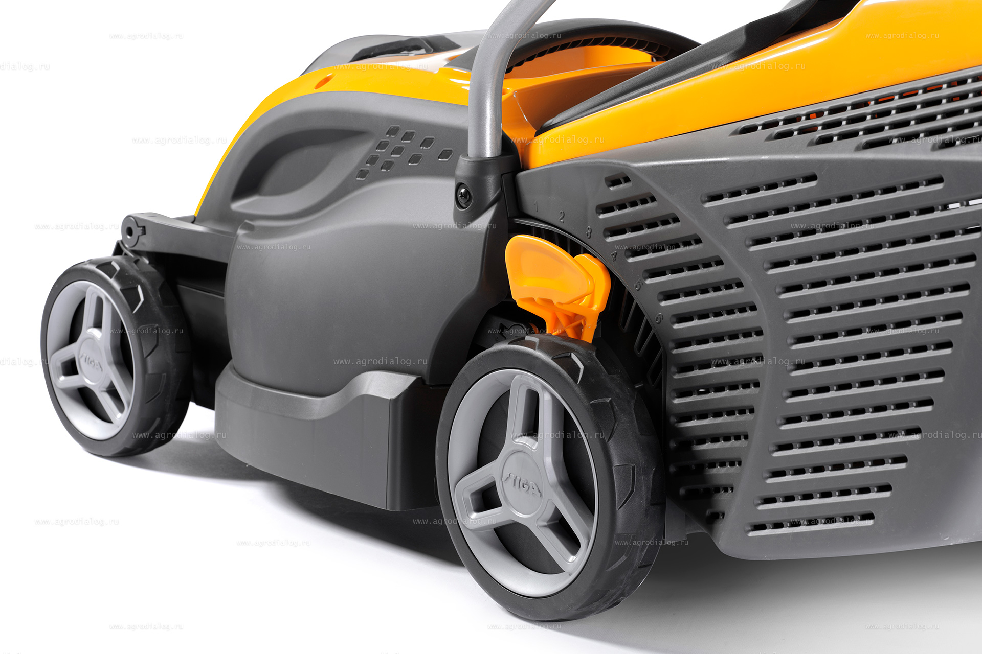 - Задний выброс без травосборника удобен при скашивании высокой травы.