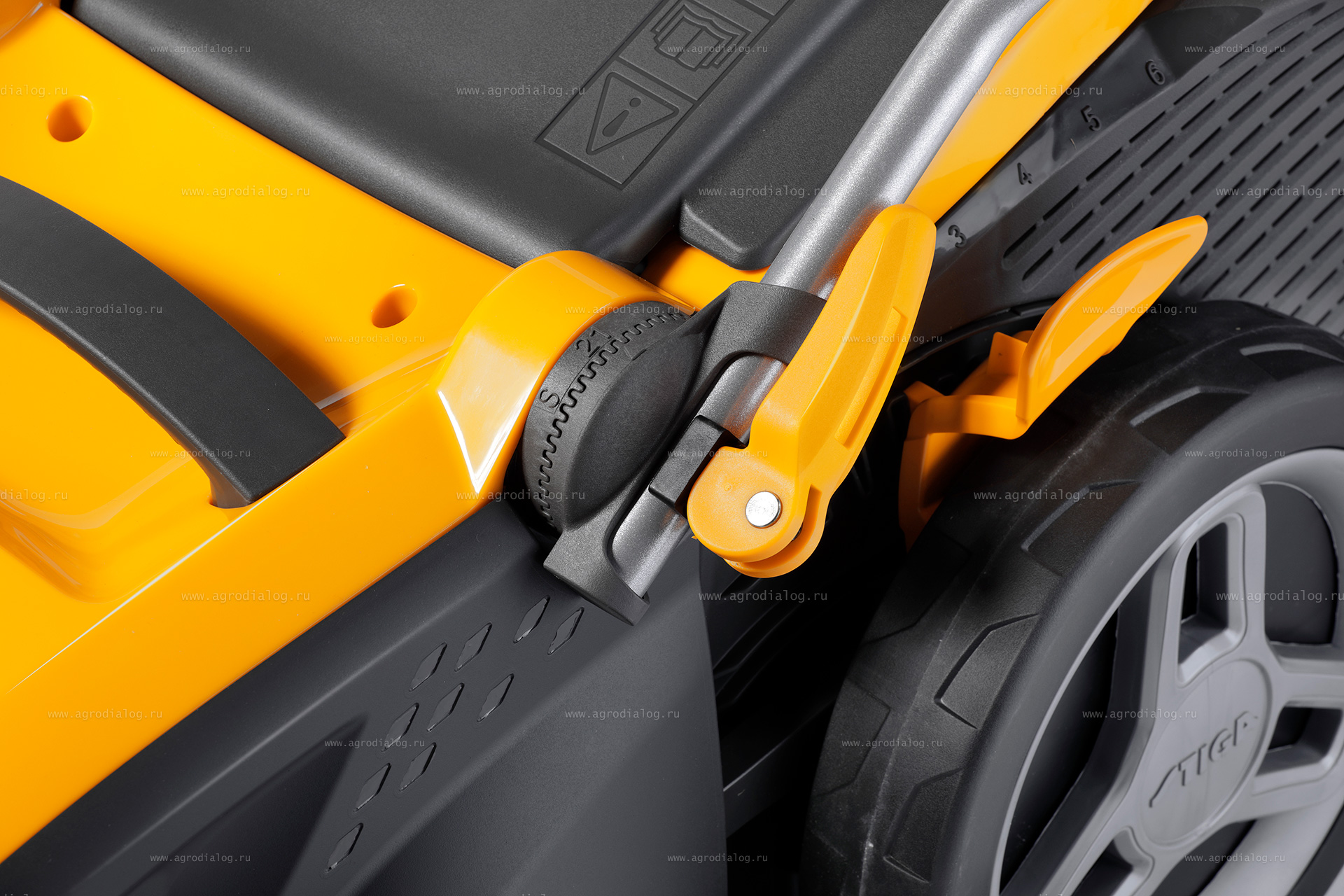 - Рукоятка управления регулируется по высоте: никаких болтов подкручивать не нужно, у нее есть быстрозажимные фиксаторы. В то же время она может складываться для удобного и компактного хранения газонокосилки.