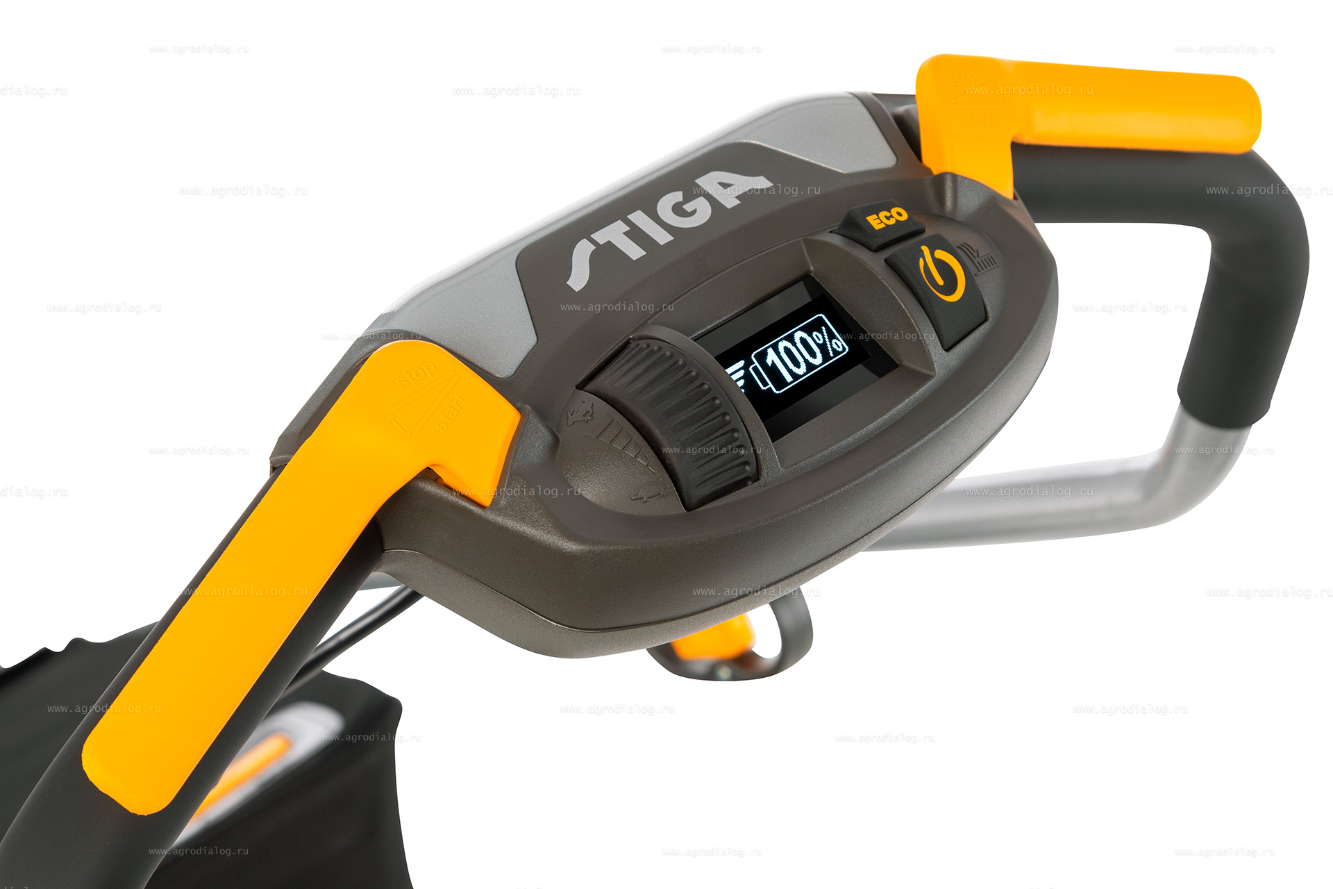 - Форма рукоятки управления обеспечивает минимальное напряжение рук в ходе работы, а возможность регулировки по высоте позволяет подобрать наиболее удобное положение людям разного роста: никаких болтов подкручивать не нужно, у нее есть инновационная система регулировки по высоте одним движением. В то же время она может складываться для удобного и компактного хранения самоходной аккумуляторной газонокосилки Stiga Twinclip 50 SQ DAE.