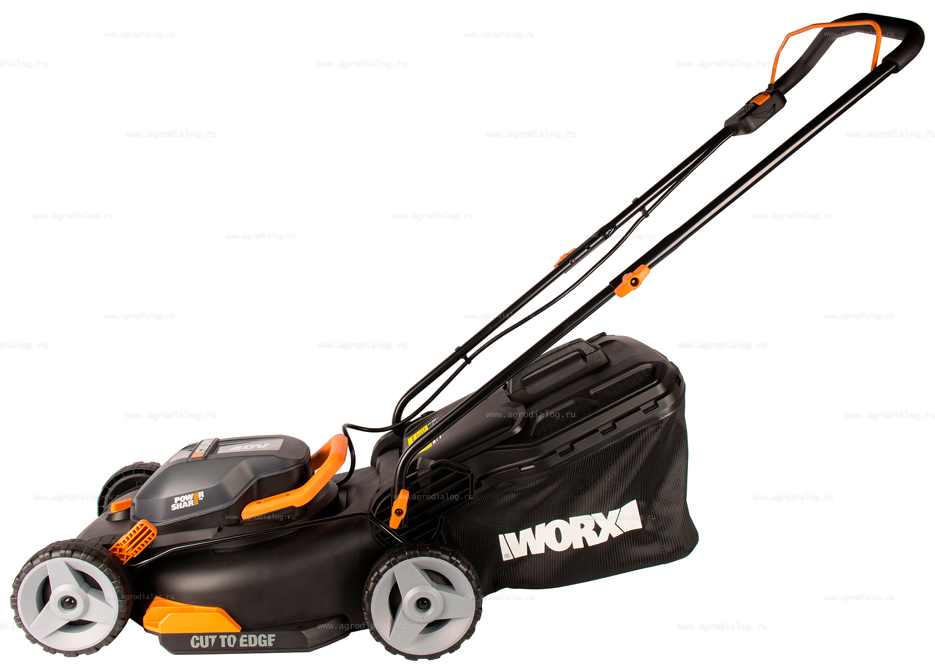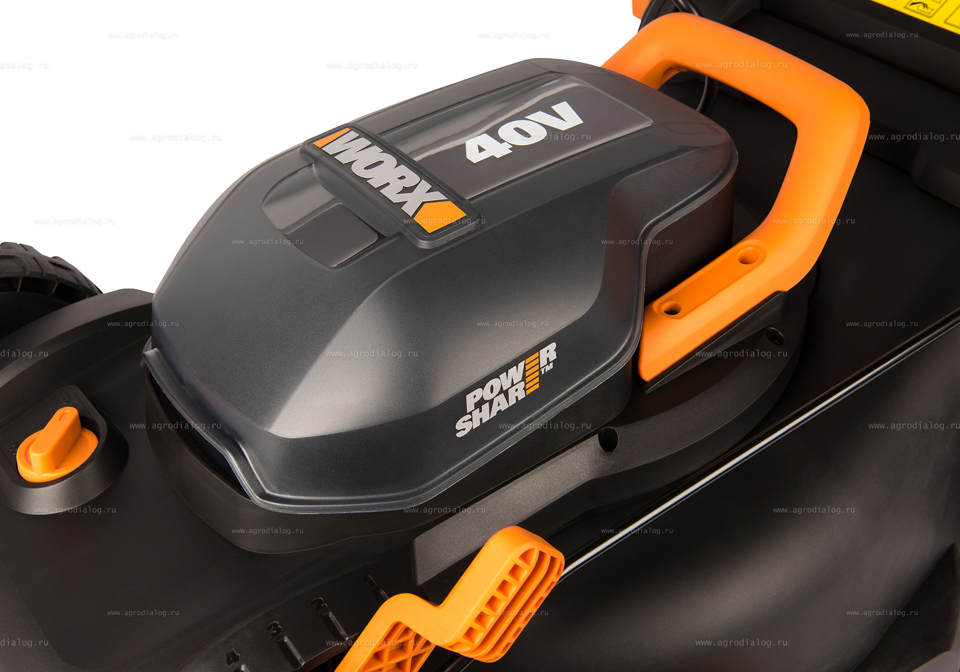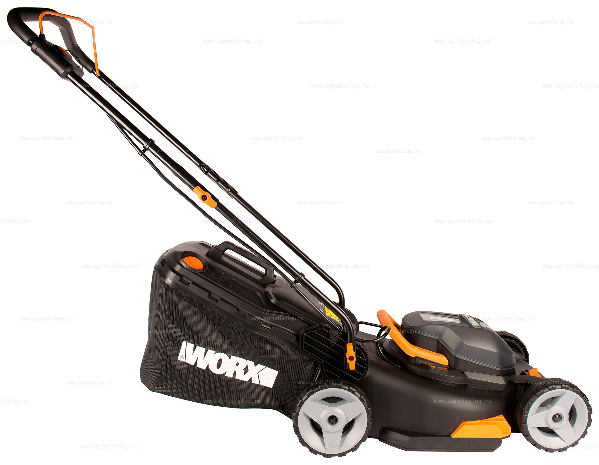 - Несамоходная аккумуляторная газонокосилка Worx WG743E имеет два штатных места под аккумуляторы. Время автономной работы увеличивается вдвое. Для обеспечения максимальной автономной работы рекомендуется устанавливать два полностью заряженных аккумулятора.