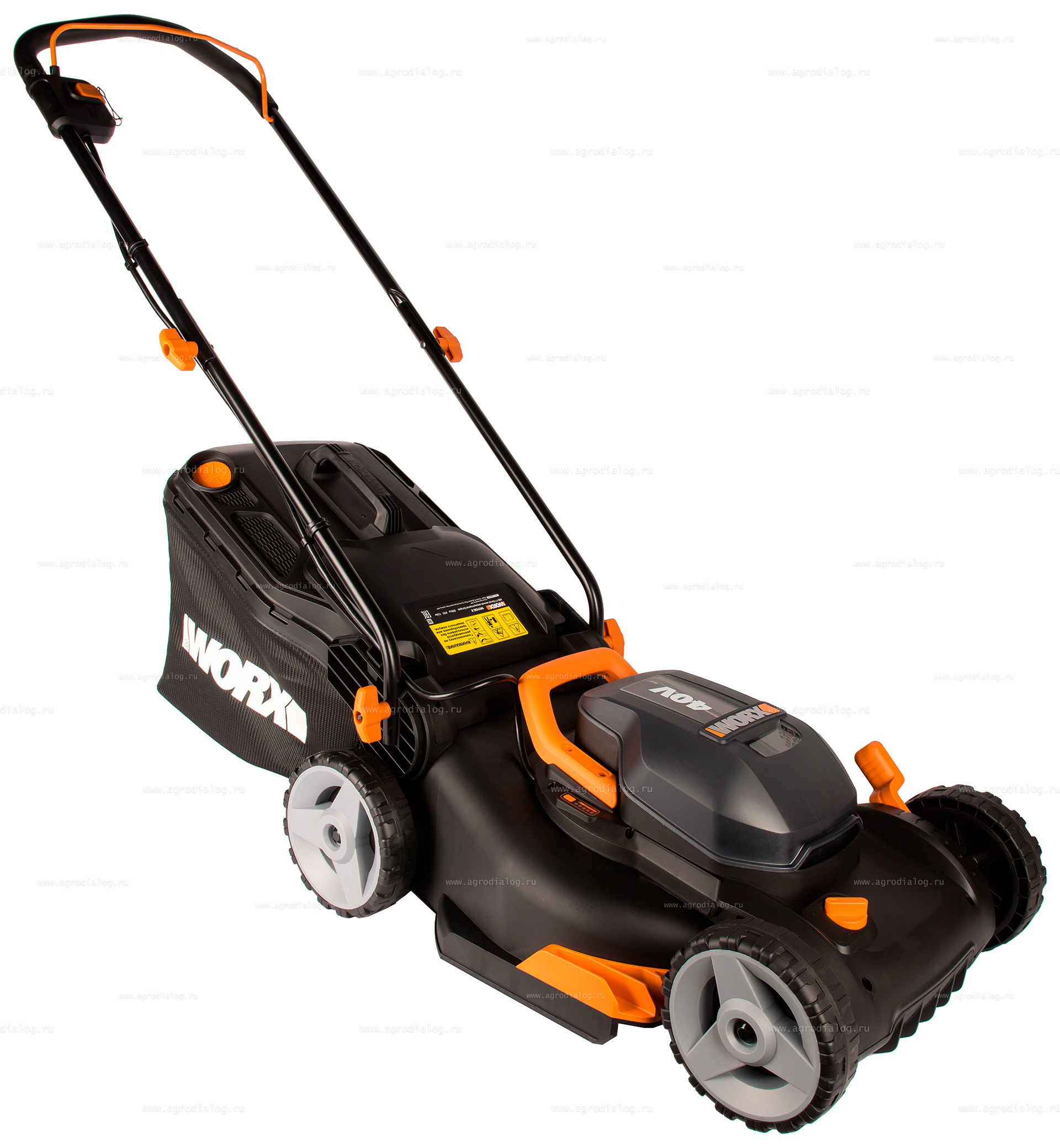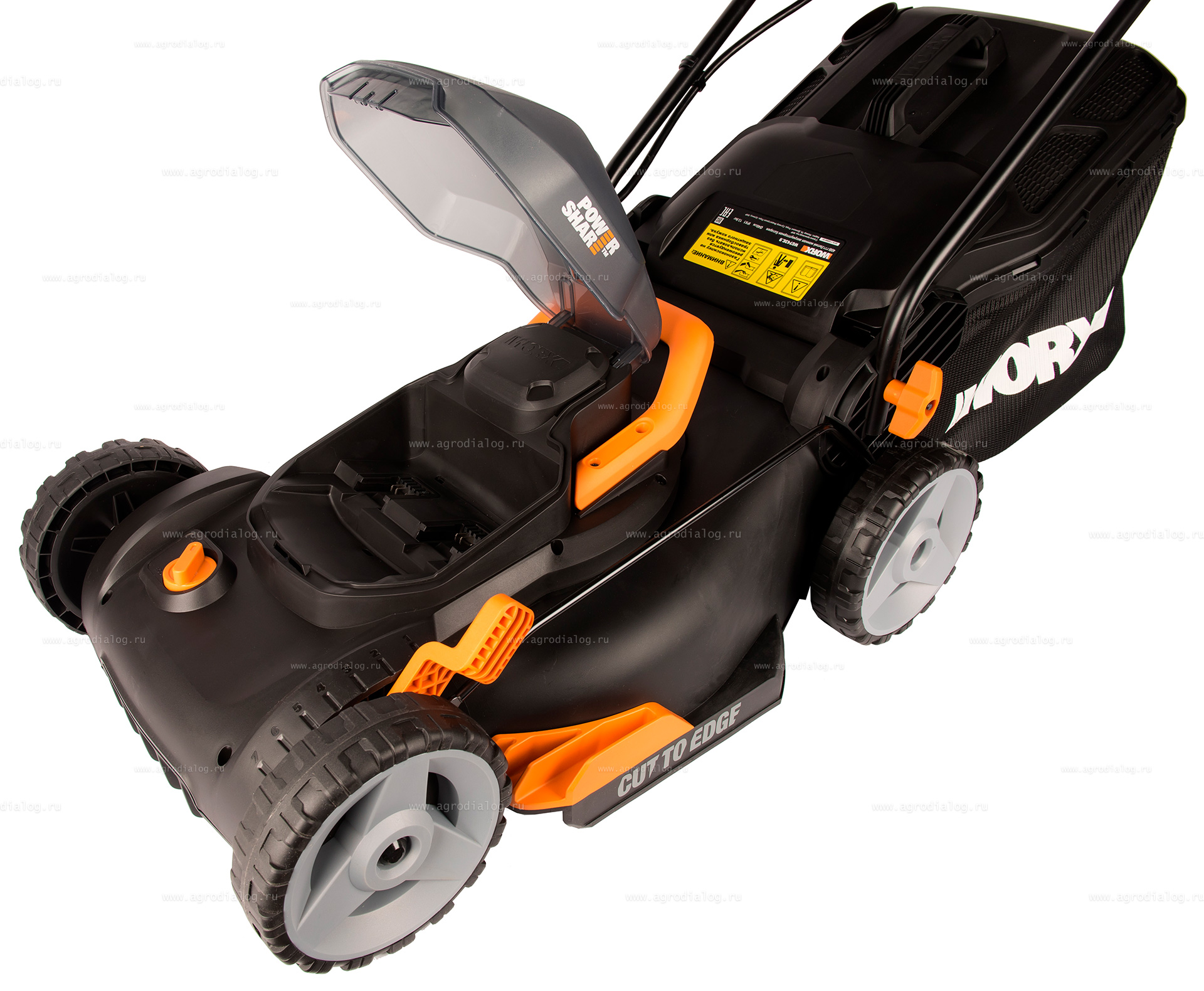 - Несамоходная аккумуляторная газонокосилка Worx WG743E.9 имеет два штатных места под аккумуляторы. Время автономной работы увеличивается вдвое. Для обеспечения максимальной автономной работы рекомендуется устанавливать два полностью заряженных аккумулятора.