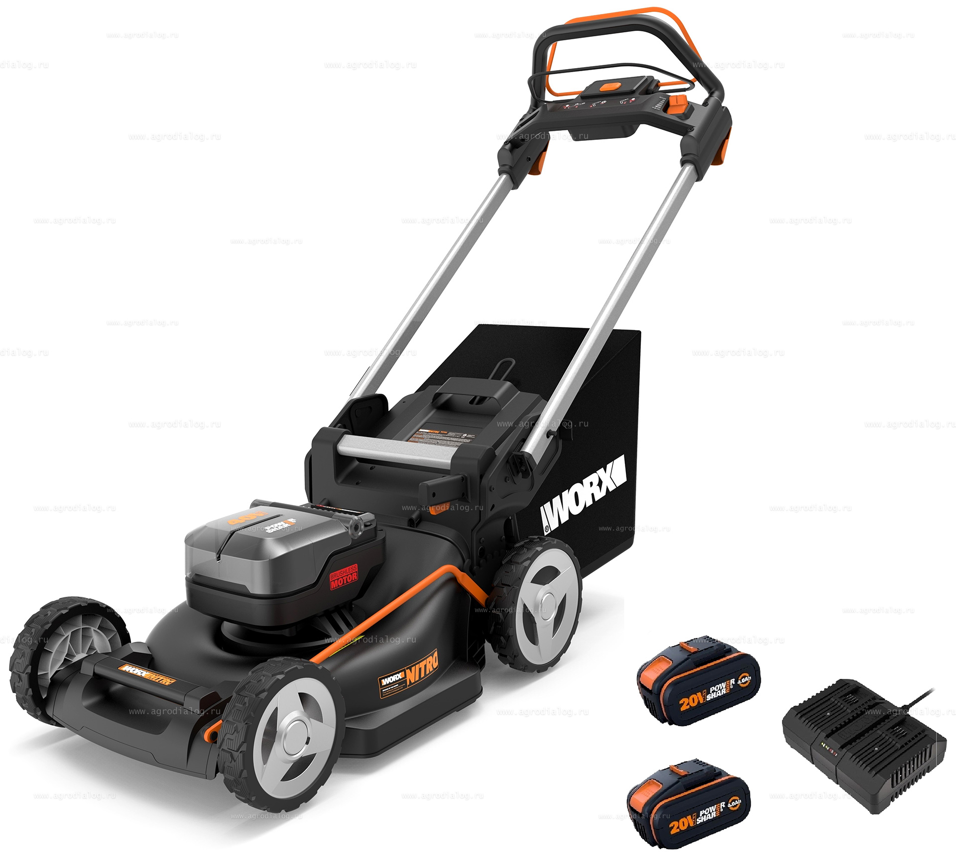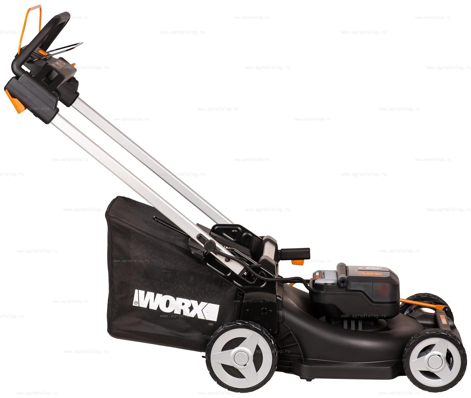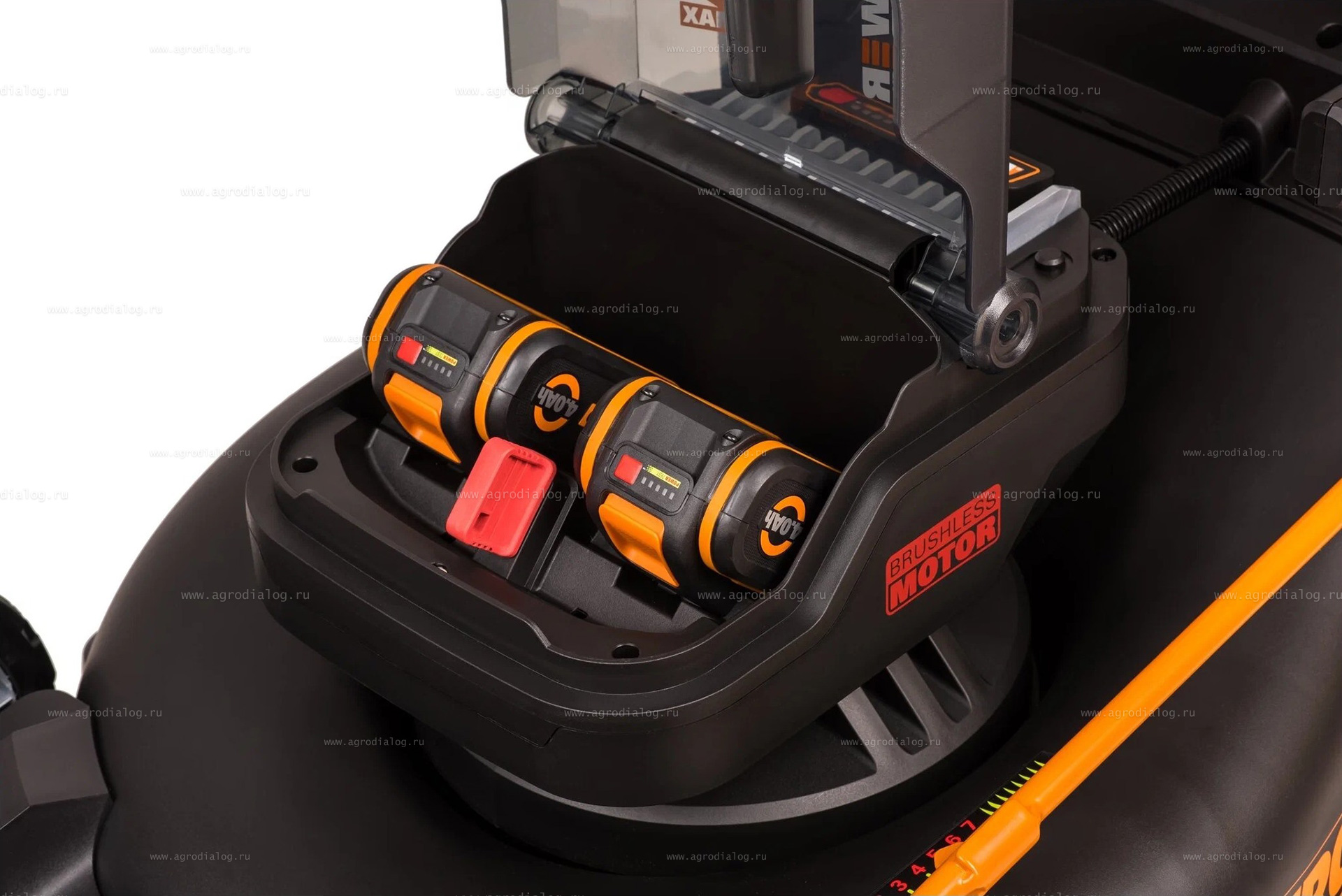 - Самоходная аккумуляторная газонокосилка Worx WG749E имеет два штатных места под аккумуляторы. Время автономной работы увеличивается вдвое. Для обеспечения максимальной автономной работы рекомендуется устанавливать два полностью заряженных аккумулятора.
