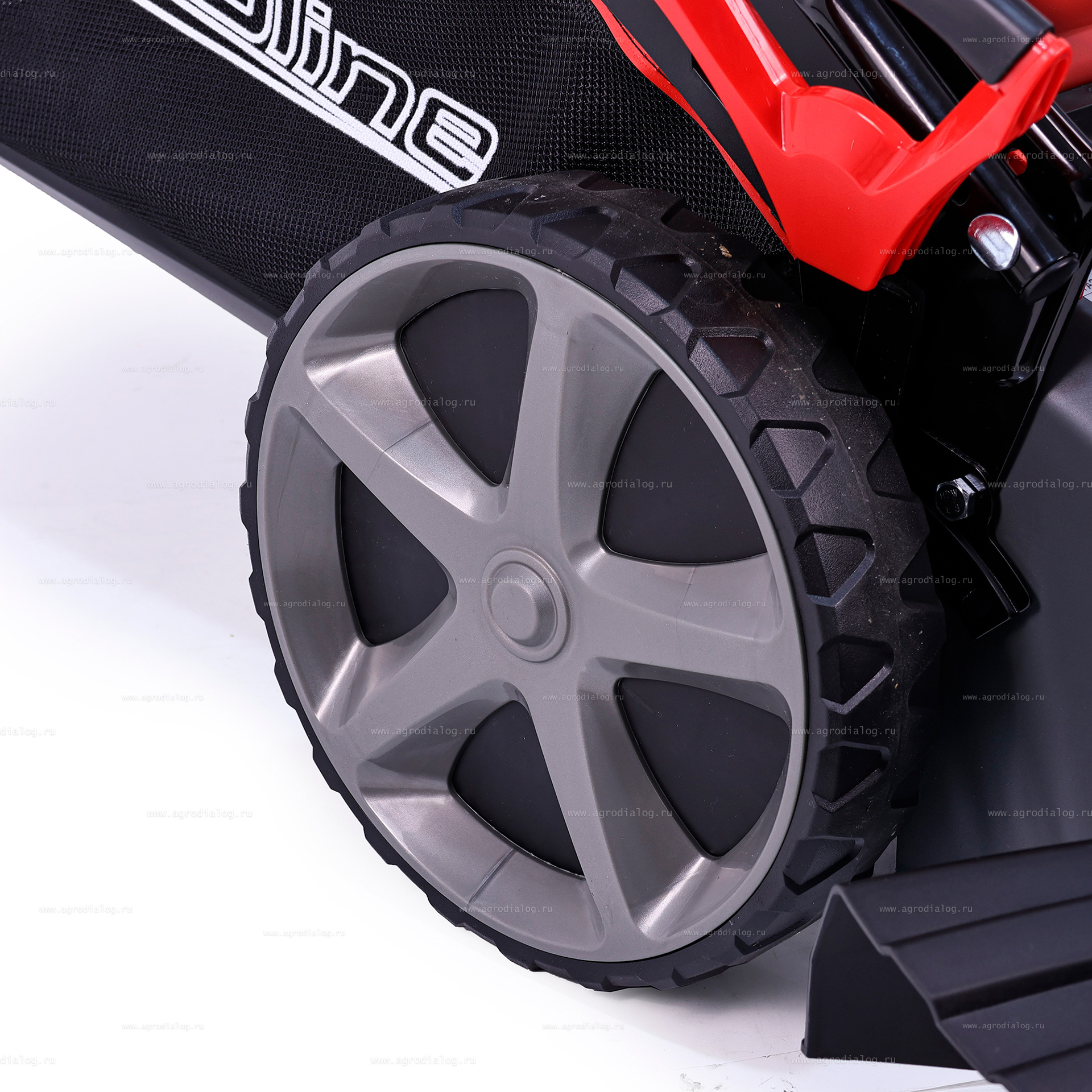 - Для обеспечения максимальной маневренности при кошении участков с большим количеством кустарников и деревьев бензиновая газонокосилка EVOline LMG 51 CVH TURN оборудована передними поворотными колесами с функцией блокировки. Подшипники обеспечивают плавность хода и минимальный люфт даже после многолетней эксплуатации.