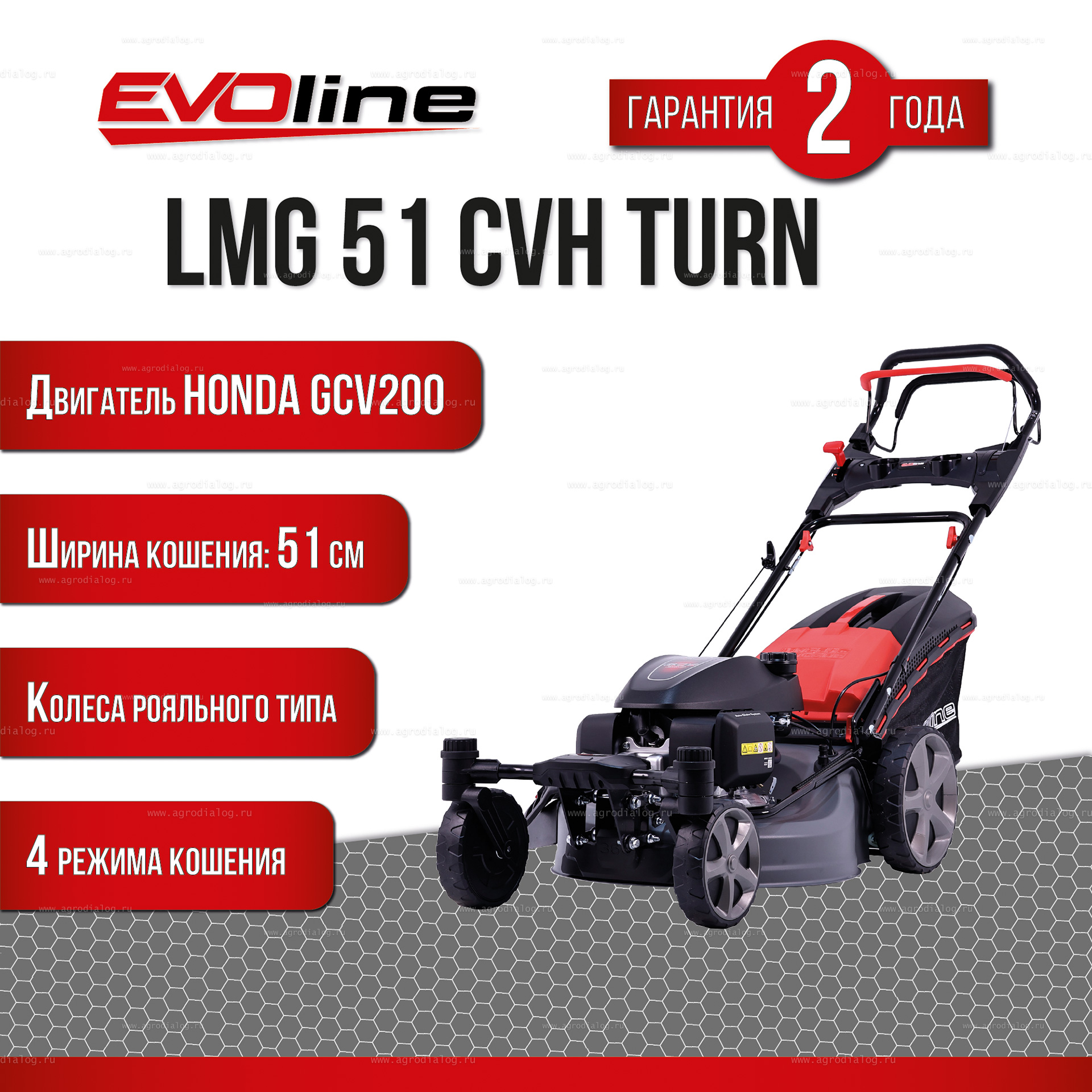 - Бензиновая газонокосилка EVOline LMG 51 CVH TURN оснащена косильным ножом повышенной прочности, со специально подобранным углом атаки режущей кромки.