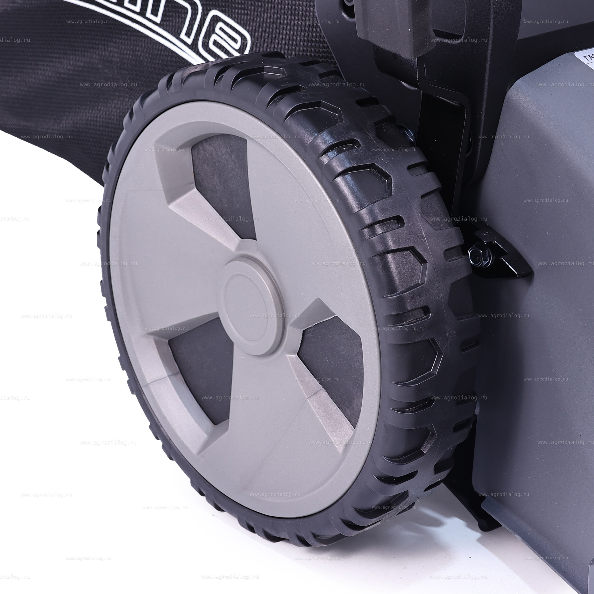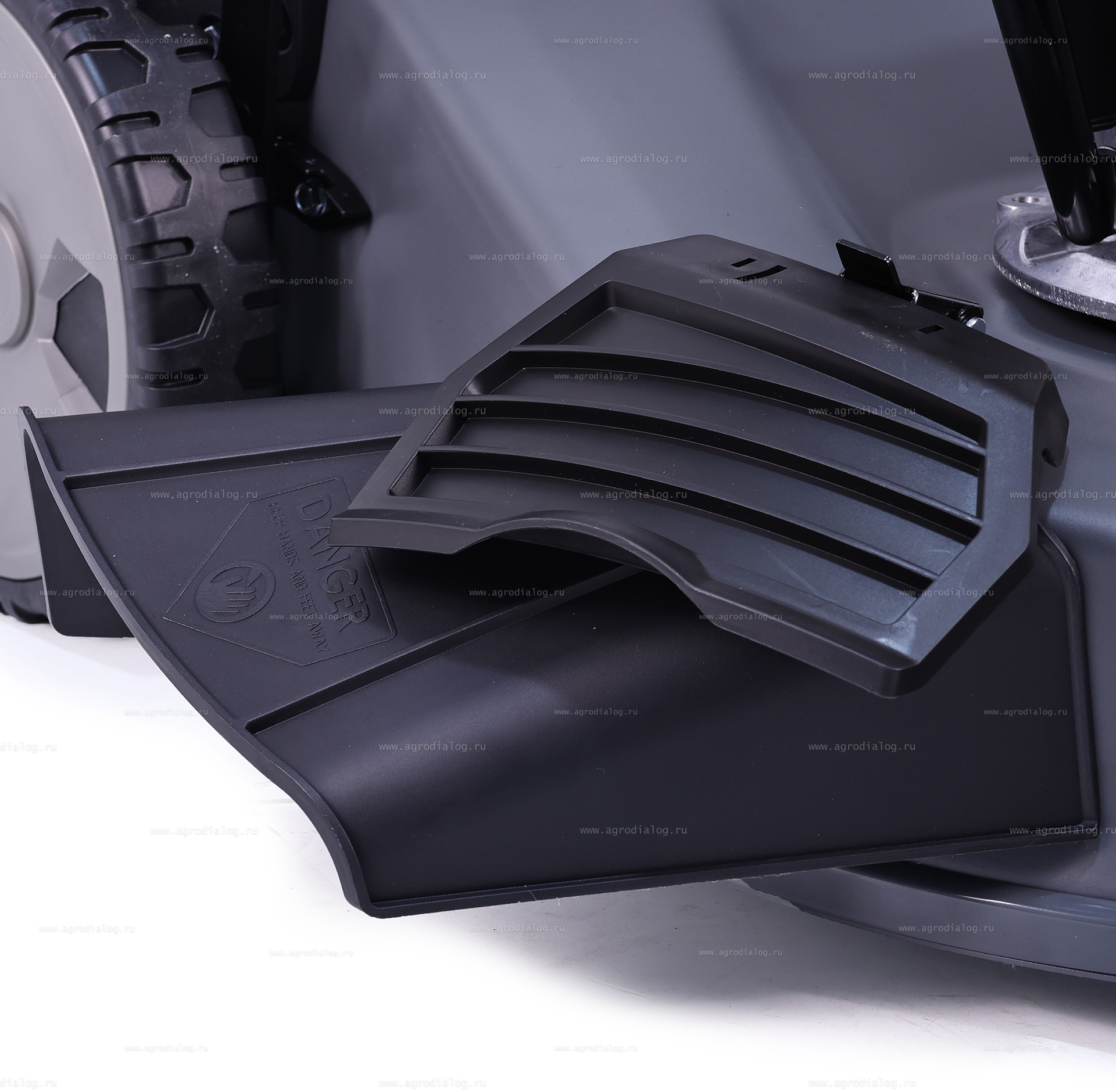 - Металлический бампер защищает переднюю часть газонокосилки и подготавливает траву для аккуратного среза.