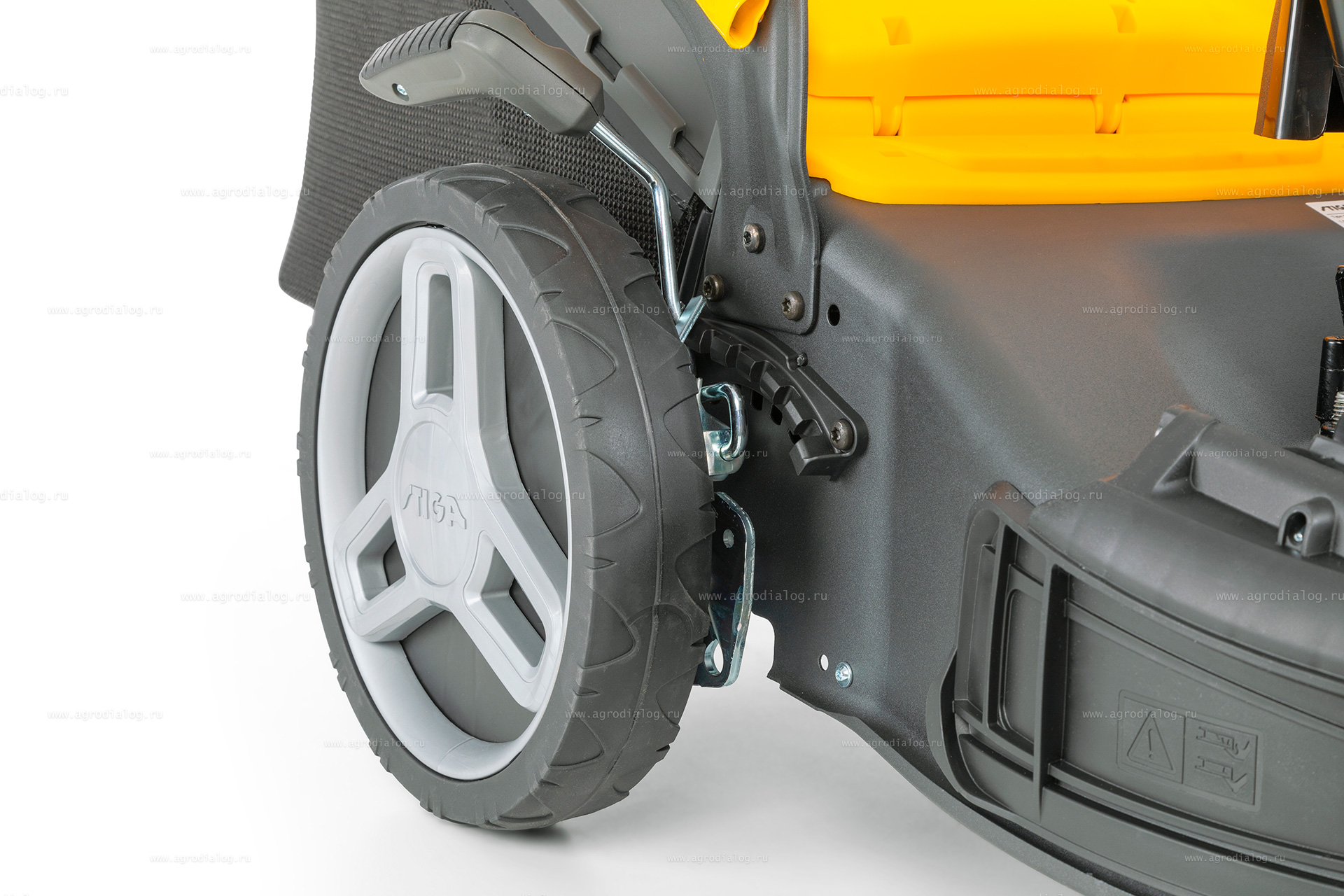 - Задний привод обеспечивает отличное сцепление с газонным покрытием на неровной и холмистой местности.