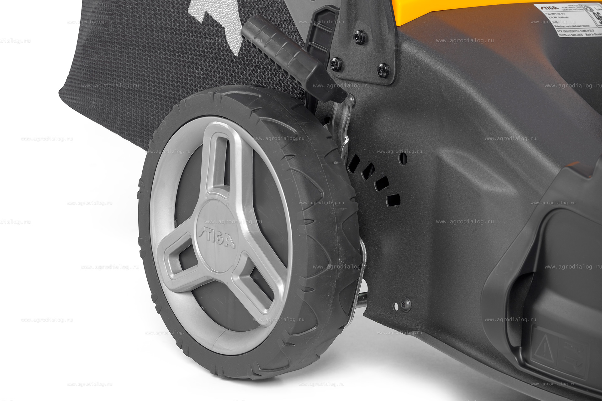 - Задний привод обеспечивает отличное сцепление с газонным покрытием на неровной и холмистой местности.