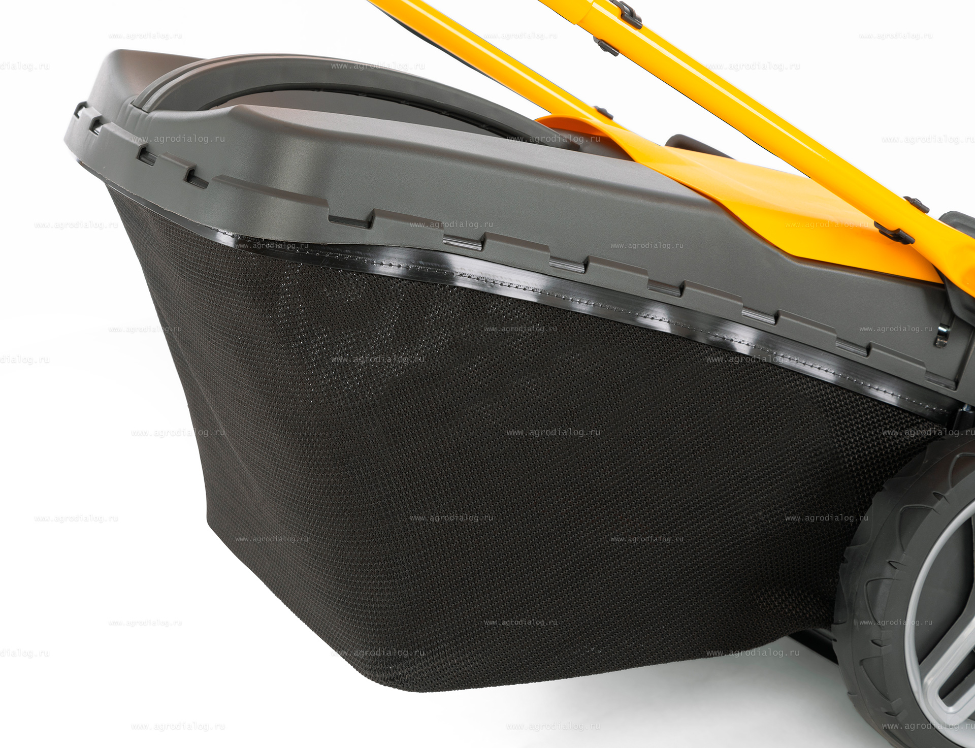 - Большой комбинированный травосборник на 60 литров оснащен сбалансированной подъемной рукояткой для упрощения снятия и установки, встроенный индикатор заполнения подскажет о необходимости его опустошения. Тканый материал, применяемый при его изготовлении, надежно удерживает пыль и пыльцу растений, благодаря чему люди, страдающие аллергией, могут работать в свое удовольствие.