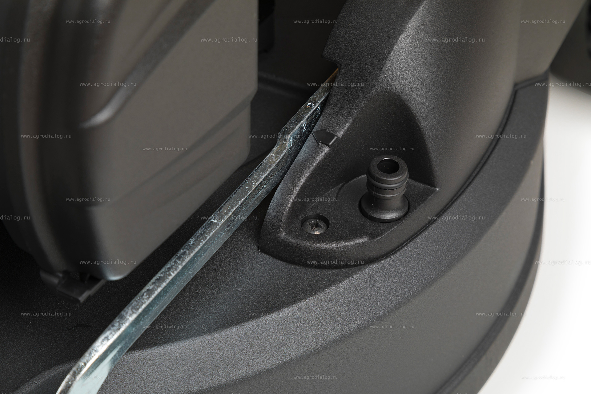 - Штуцер для поливочного шланга облегчает очистку режущей деки. Присоедините шланг, включите воду, запустите двигатель, и вы получите очищенную деку. Для достижения оптимальных результатов очищайте деку сразу после использования.