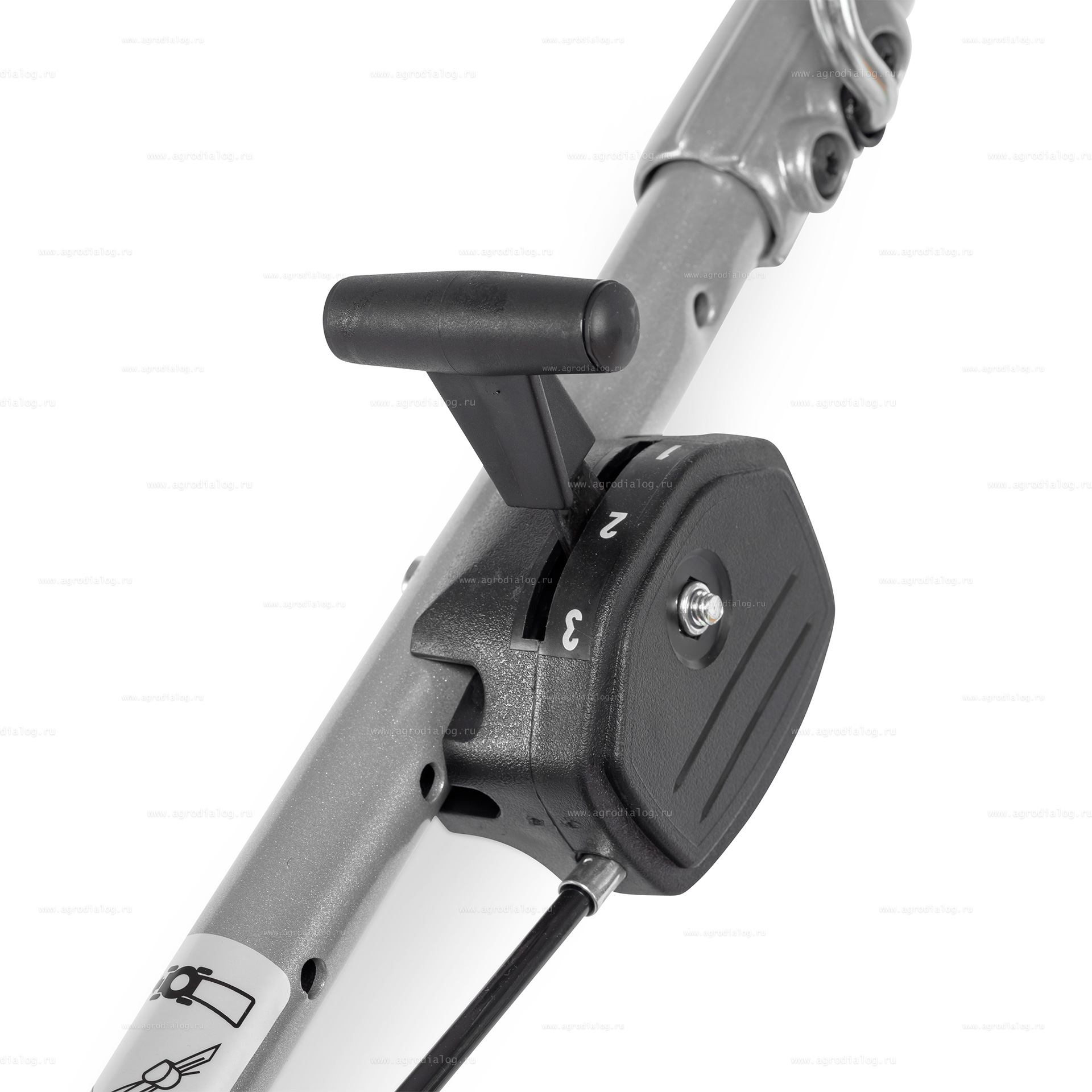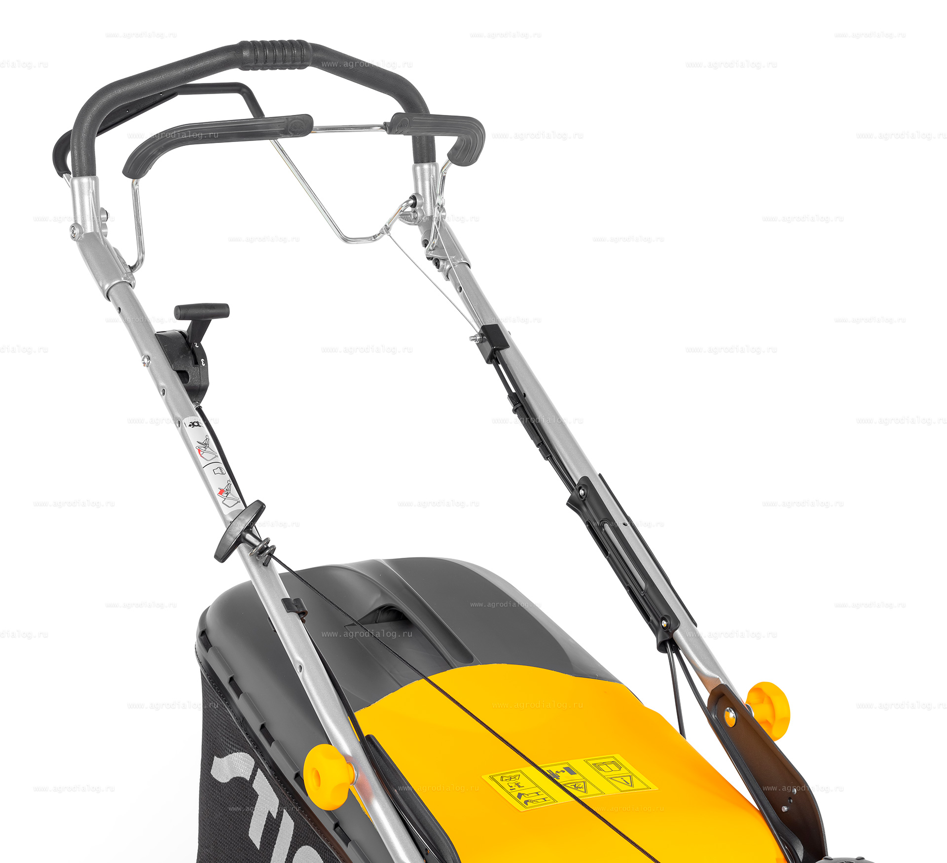 - Эргономичная рукоятка управления с мягким покрытием обеспечивает пониженную вибрацию и минимальное напряжение рук в ходе работы. Возможность регулировки по высоте позволяет подобрать наиболее удобное положение людям разного роста. Складывается для удобной транспортировки и хранения.