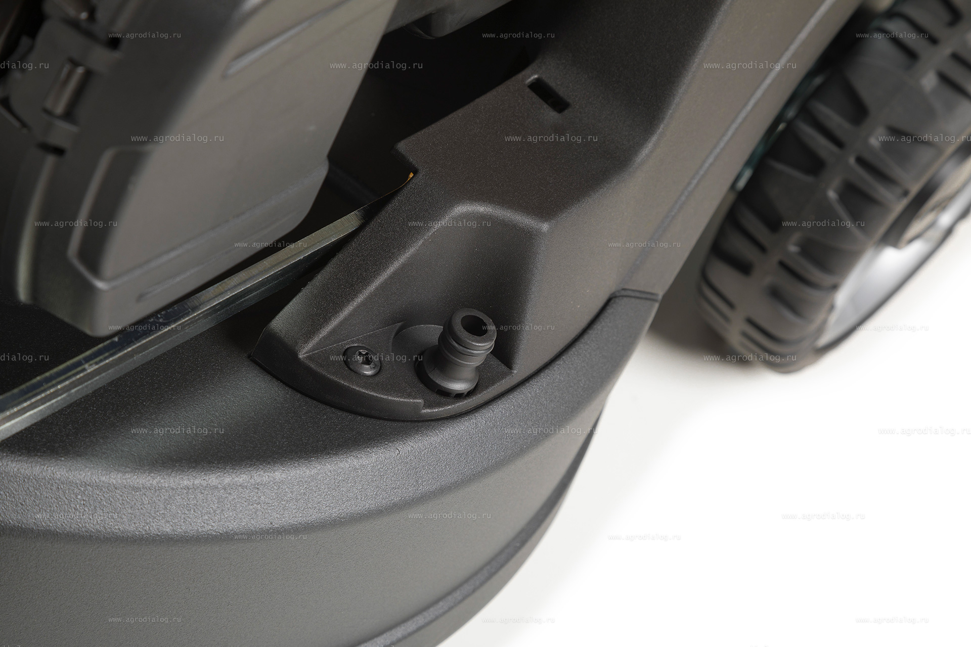 - Штуцер для поливочного шланга облегчает очистку режущей деки. Присоедините шланг, включите воду, запустите двигатель, и вы получите очищенную деку. Для достижения оптимальных результатов очищайте деку сразу после использования.