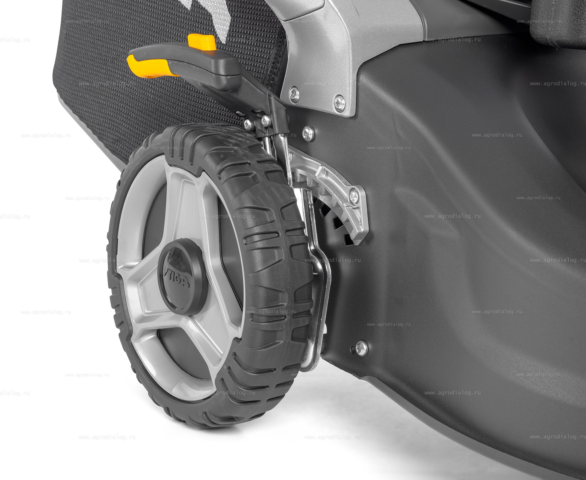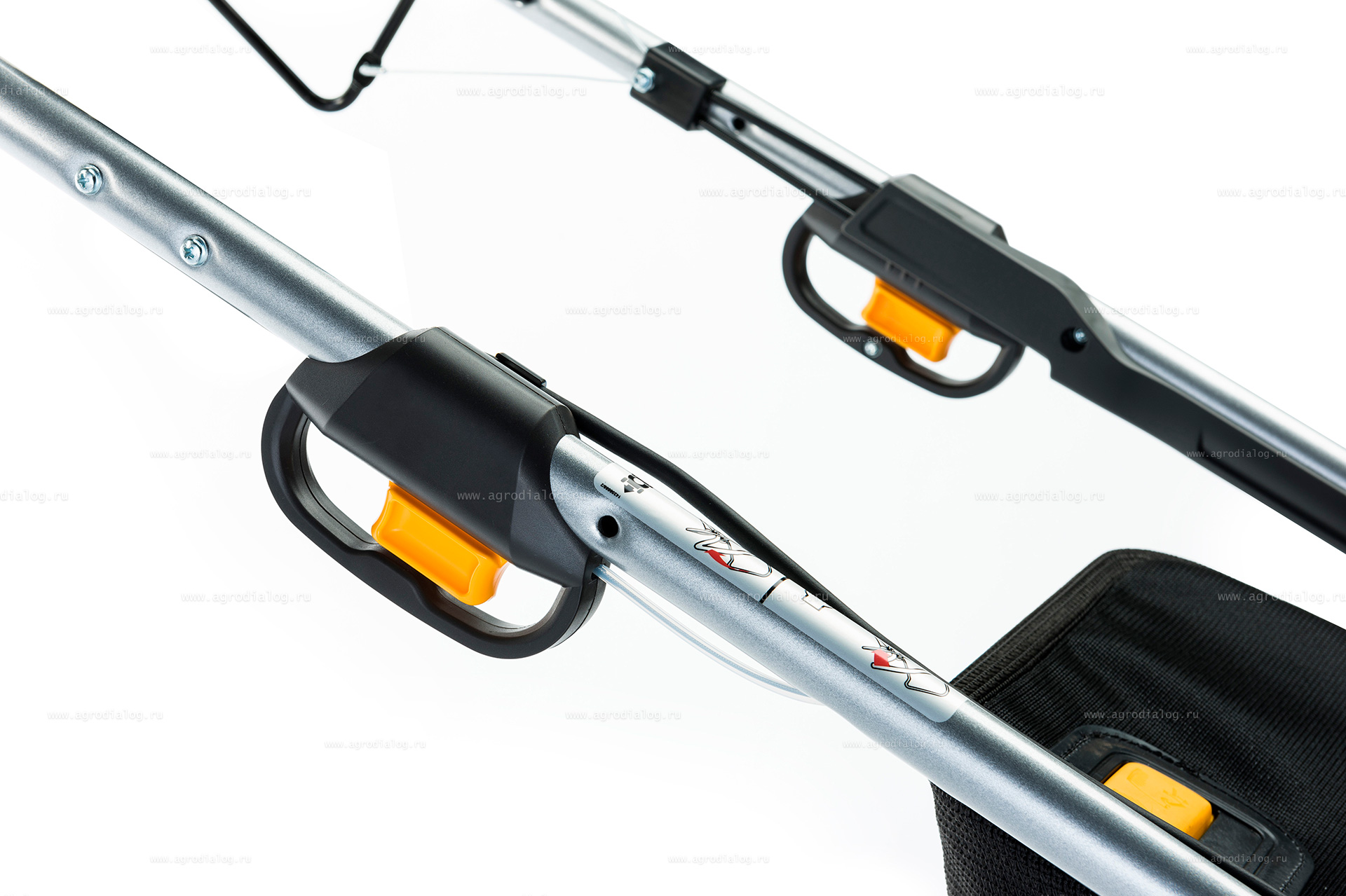 - Эргономичная рукоятка управления обеспечивает минимальное напряжение рук в ходе работы, мягкая обтяжка снижает вибрацию. Инновационная система регулировки по высоте одним движением, позволяет подобрать наиболее удобное положение людям разного роста. Складывается для удобной транспортировки и хранения.