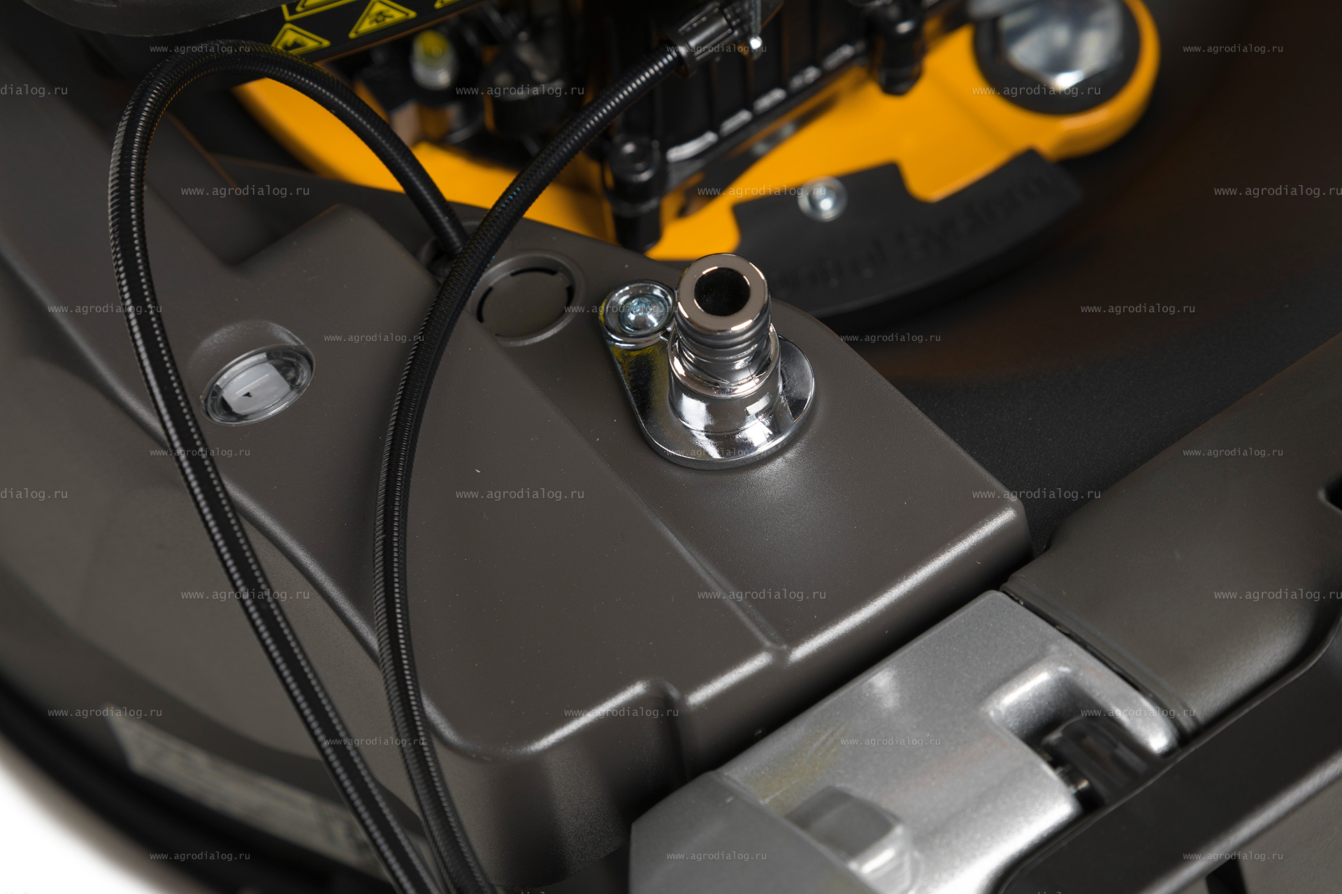 - Для очистки деки от скошенной травы присоедините шланг с водой к штуцеру встроенному в корпус деки. Присоедините шланг, включите воду, запустите двигатель, и вы получите очищенную деку. Для достижения оптимальных результатов очищайте деку сразу после использования.