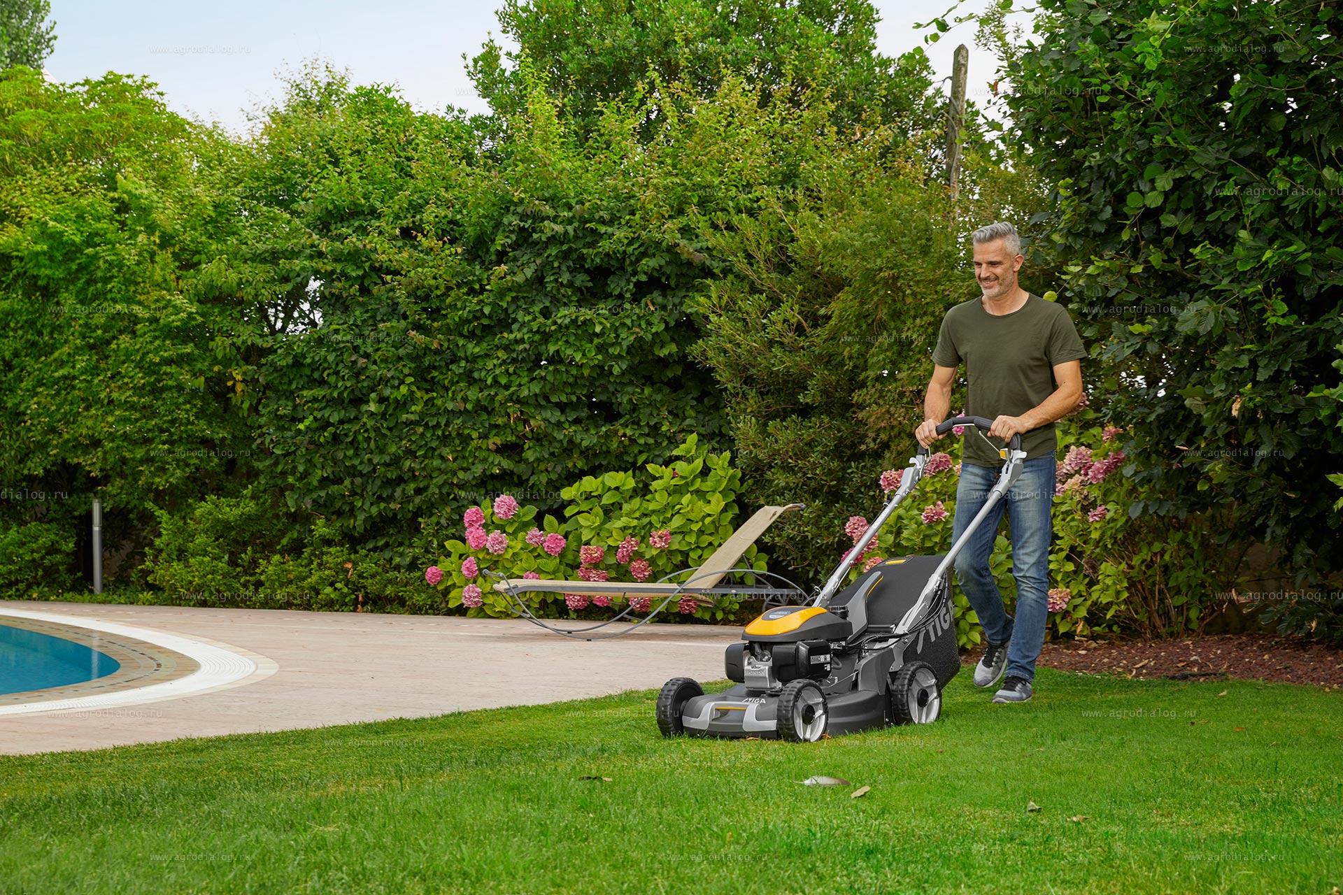 - Эргономичная рукоятка управления обеспечивает минимальное напряжение рук в ходе работы, мягкая обтяжка снижает вибрацию. Инновационная система регулировки по высоте одним движением, позволяет подобрать наиболее удобное положение людям разного роста. Складывается для удобной транспортировки и хранения.