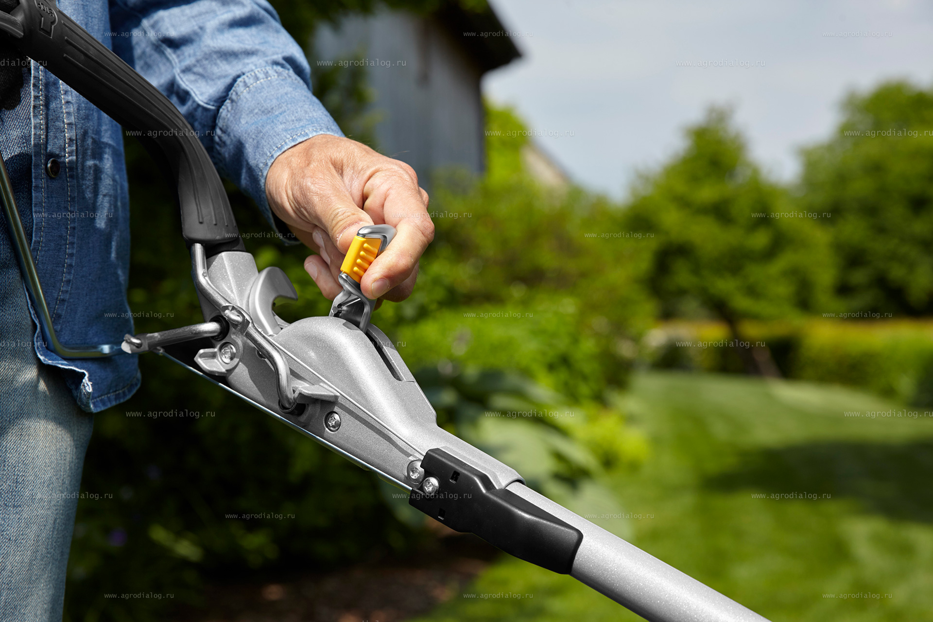 - Эргономичная рукоятка управления обеспечивает минимальное напряжение рук в ходе работы, мягкая обтяжка снижает вибрацию. Инновационная система регулировки по высоте одним движением, позволяет подобрать наиболее удобное положение людям разного роста. Складывается для удобной транспортировки и хранения.
