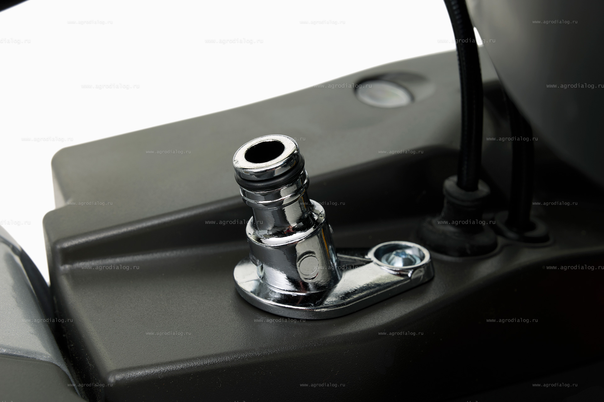 - Для очистки деки от скошенной травы присоедините шланг с водой к штуцеру встроенному в корпус деки. Присоедините шланг, включите воду, запустите двигатель, и вы получите очищенную деку. Для достижения оптимальных результатов очищайте деку сразу после использования.