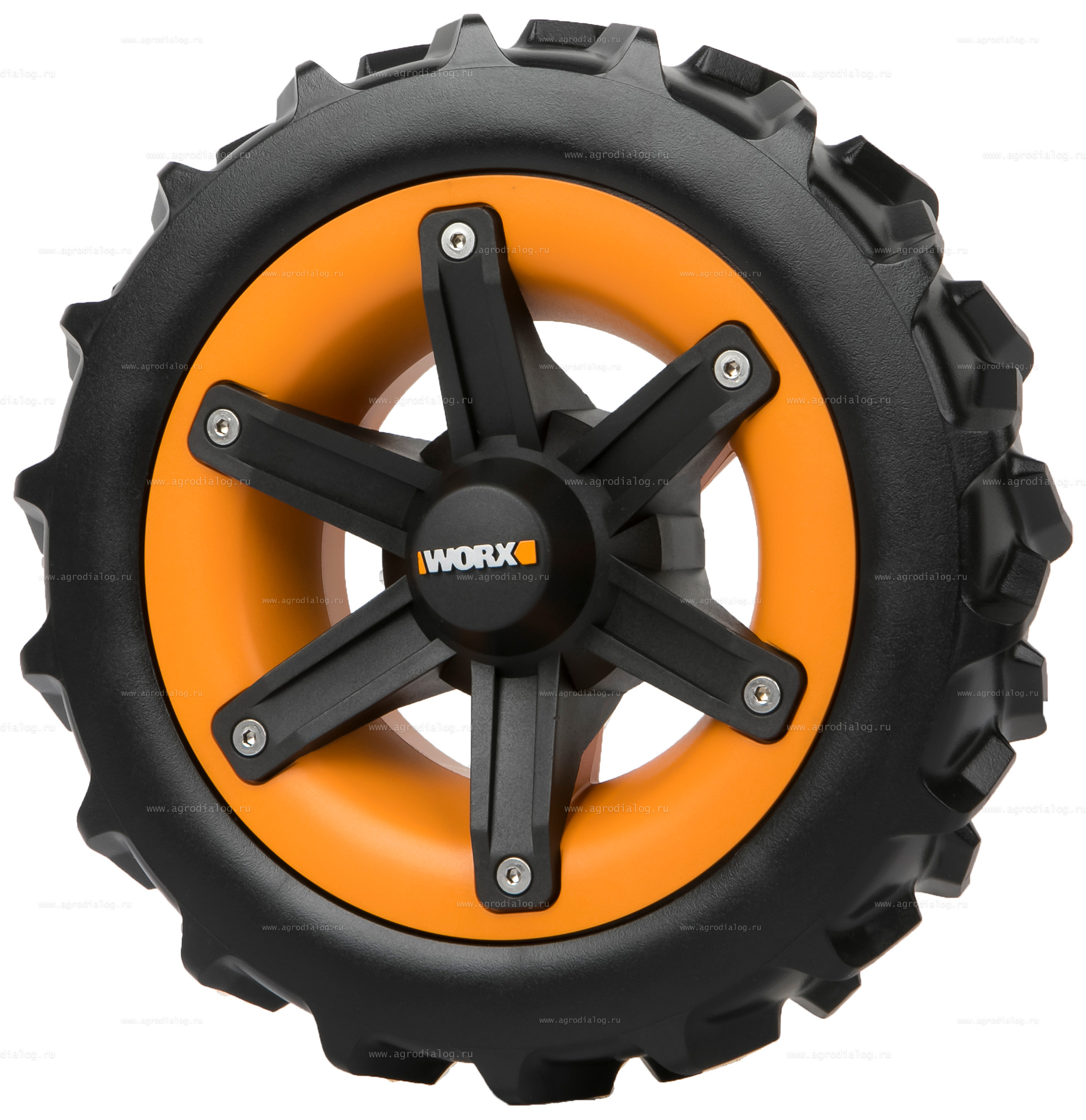Комплект Worx WA0953, содержащий специальные колеса повышенной проходимости "V-образный протектор" для отличного сцепления на газонах с уклонами до 24°. В зависимости от погоды и качества газона производительность кошения на склонах и по краям участка может вырасти до 5%. Данный товар приобретается только в комплекте с роботом-газонокосилкой.