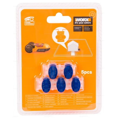 Комплект Worx WA0198 включает прорезиненные соединители в количестве 5 штук. Надёжное крепление при сохранении эластичности провода на точке стыка обеспечивает качественное наращивание длины до нужных потребителю параметров. В случае, если ограничительный провод был поврежден грызунами или садовой техникой, универсальный соединитель поможет быстро восстановить целостность провода без демонтажа. Данный товар приобретается только в комплекте с роботом-газонокосилкой.