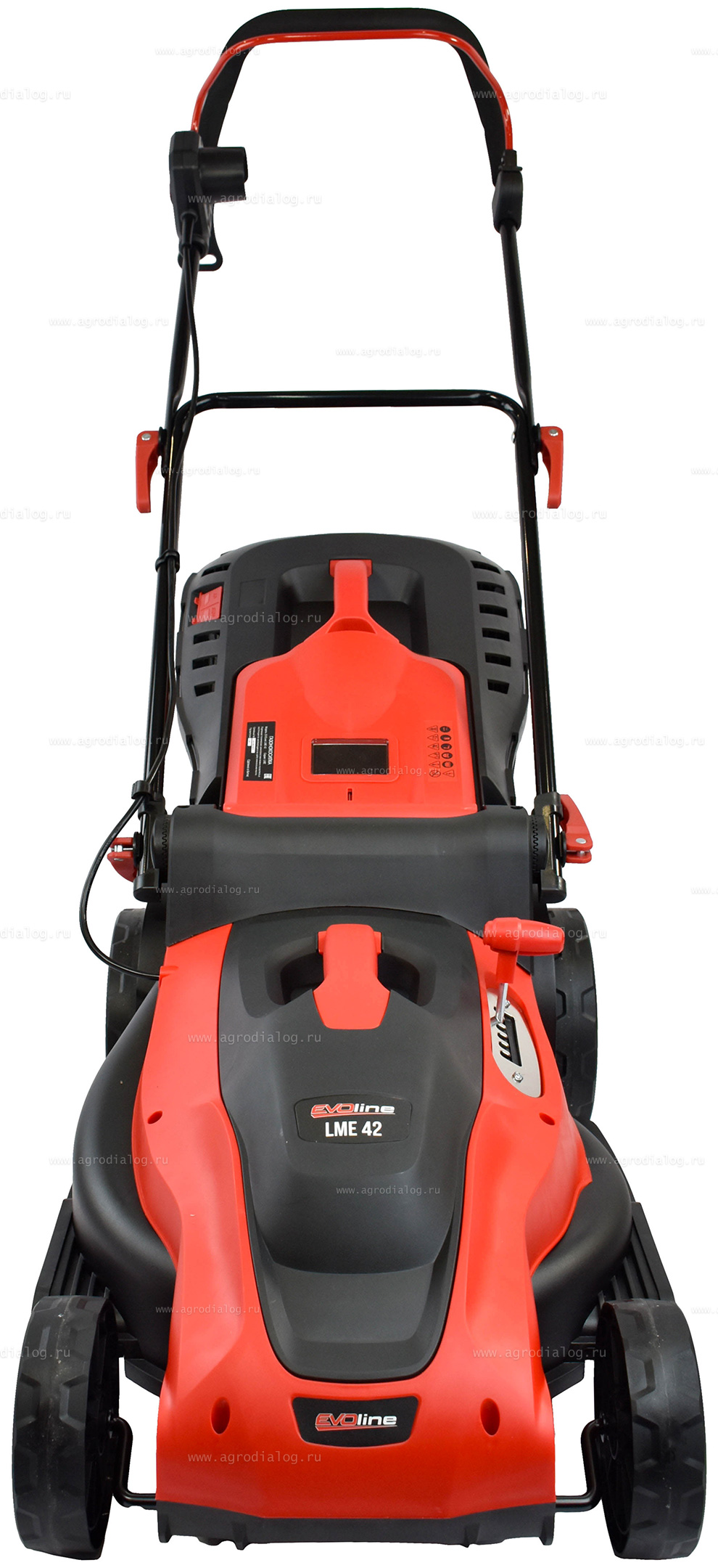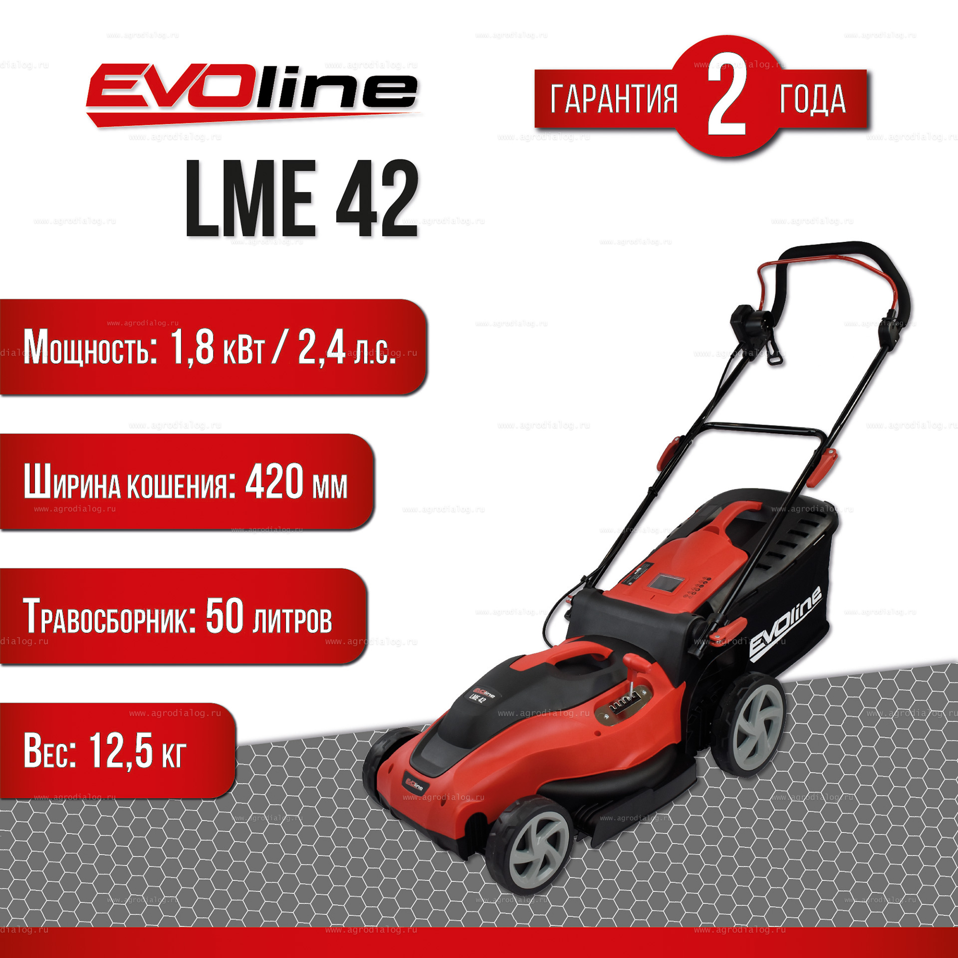 - Несамоходная электрическая газонокосилка EVOline LME 42 оснащена электрическим двигателем с защитой от попадания влаги, пыли и садового мусора. Двигатель с эффективной системой охлаждения и устройством защиты от перегрузки, что гарантирует долгий срок службы инструмента.