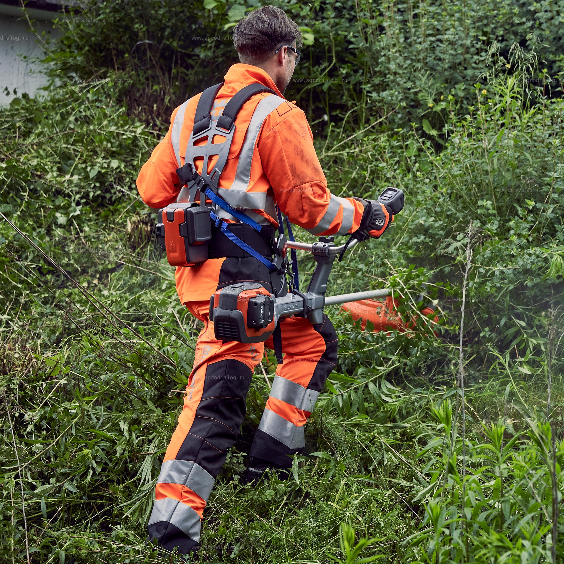 - Ранцевая ременная оснастка оптимальным образом распределяет нагрузку между плечами, грудной клеткой и спиной. Не сдавливает грудь, поэтому удобна также для женщин. Широкие плечевые ремни снижают нагрузку на тело пользователя. Система подвески с опорной пластиной позволяет управлять аккумуляторной косой с легкостью и меньшим количеством движений, что благоприятным образом сказывается на состоянии позвоночника пользователя.