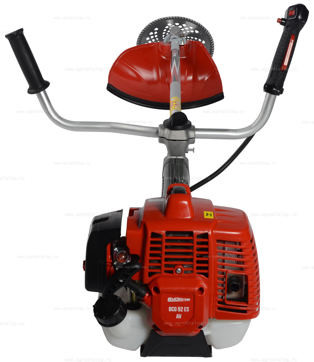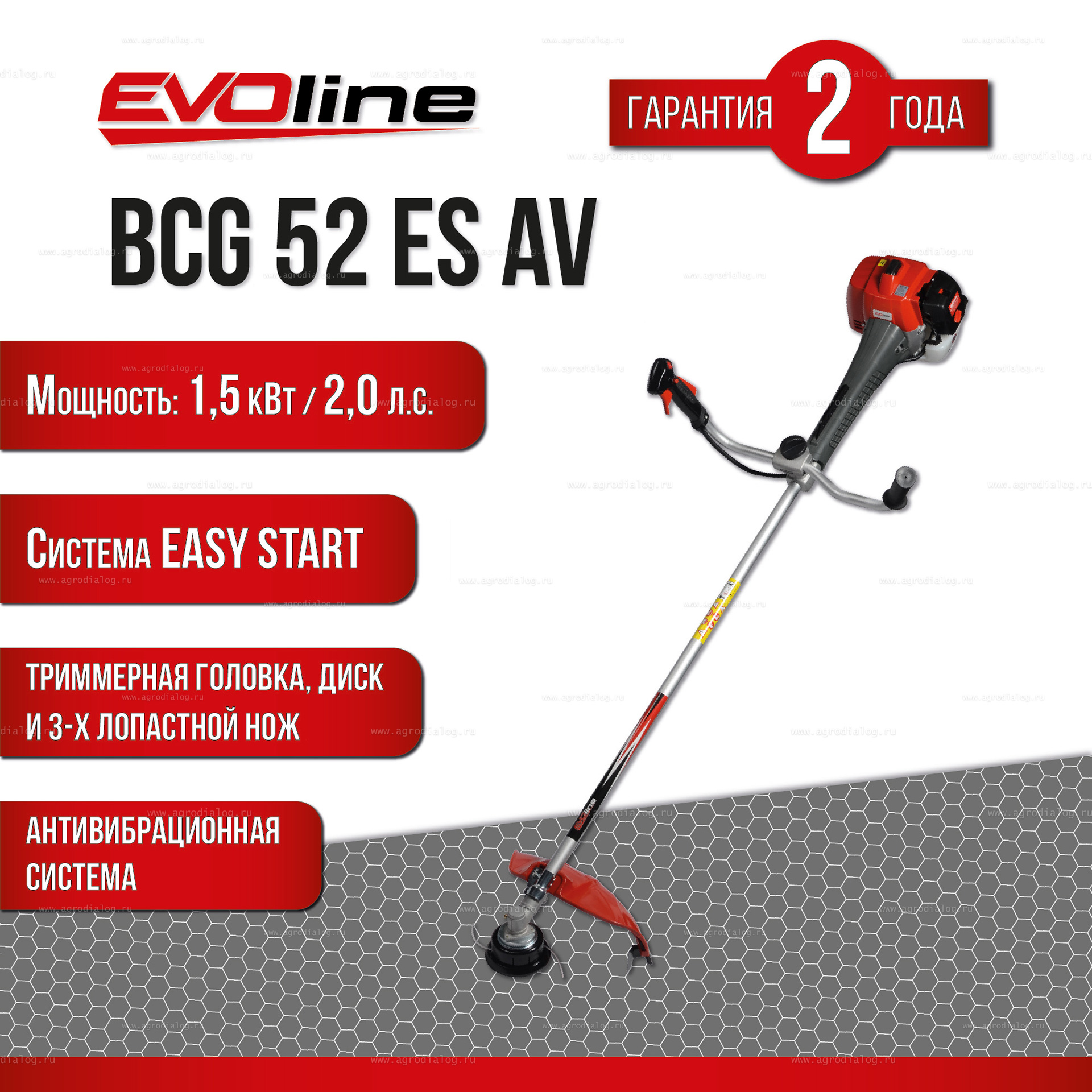 - Бензокоса EVOline BCG 52 ES AV оборудована ранцевой ременной оснасткой, которая оптимальным образом распределяет нагрузку между плечами, грудной клеткой и спиной. Широкие плечевые ремни снижают нагрузку на тело пользователя.